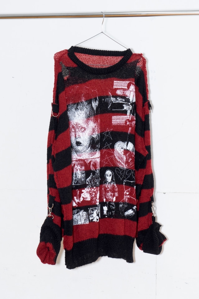 [Autumn Winter Collection] EMAW24KN01 ガーゼシャツのようなディテールを落とし込んだボーダーニット。 今シーズンの象徴的なグラフィックをフロントにプリントした目を引く一着。 長い袖は袖口がフック仕様になっており、アーム部分に施されたD缶に取り付けることで お好みのサイズ感、シルエットに調整可能です。 またインサイドアウト仕様で縫製部分等より表情のある風合いに仕上がっています。 薄手の生地感でとても軽量で柔らかく、ドレープ感の強いシルエットです。 ゆったりとしたビッグシルエットで男女問わずご着用いただけます。 Color: BLACK/RED Size: Free Material: Acrylic 55% , Nylon 30% , Wool 15% [Measuring] 着丈/ Length: 76cm 肩幅 / Shoulder Width: 70cm 身幅 / Width: 78cm 袖丈 / Sleeve Length: 60cm~78cm 着用モデル / Model: 170cm 【配送について / shipping】 ご注文いただいてから一週間以内の発送予定です。 お客様都合による交換・返品は一切お受けできませんので、予めご了承下さい。 ・[email protected] 上記のアドレスからのメールが届くよう設定お願い致します。 ご不明な点がございましたら上記連絡先までご連絡くださいませ。 ※ BASEのシステム上、数ヶ月後の発送処理が不可能なため一度配送完了メールをお送りさせていただきます。BASE上では、配送完了となりますが、実際の商品発送は記載されているお届け予定時期より順次行いますのでご注意くださいませ。 ご不明な点がございましたら上記連絡先までご連絡くださいませ。