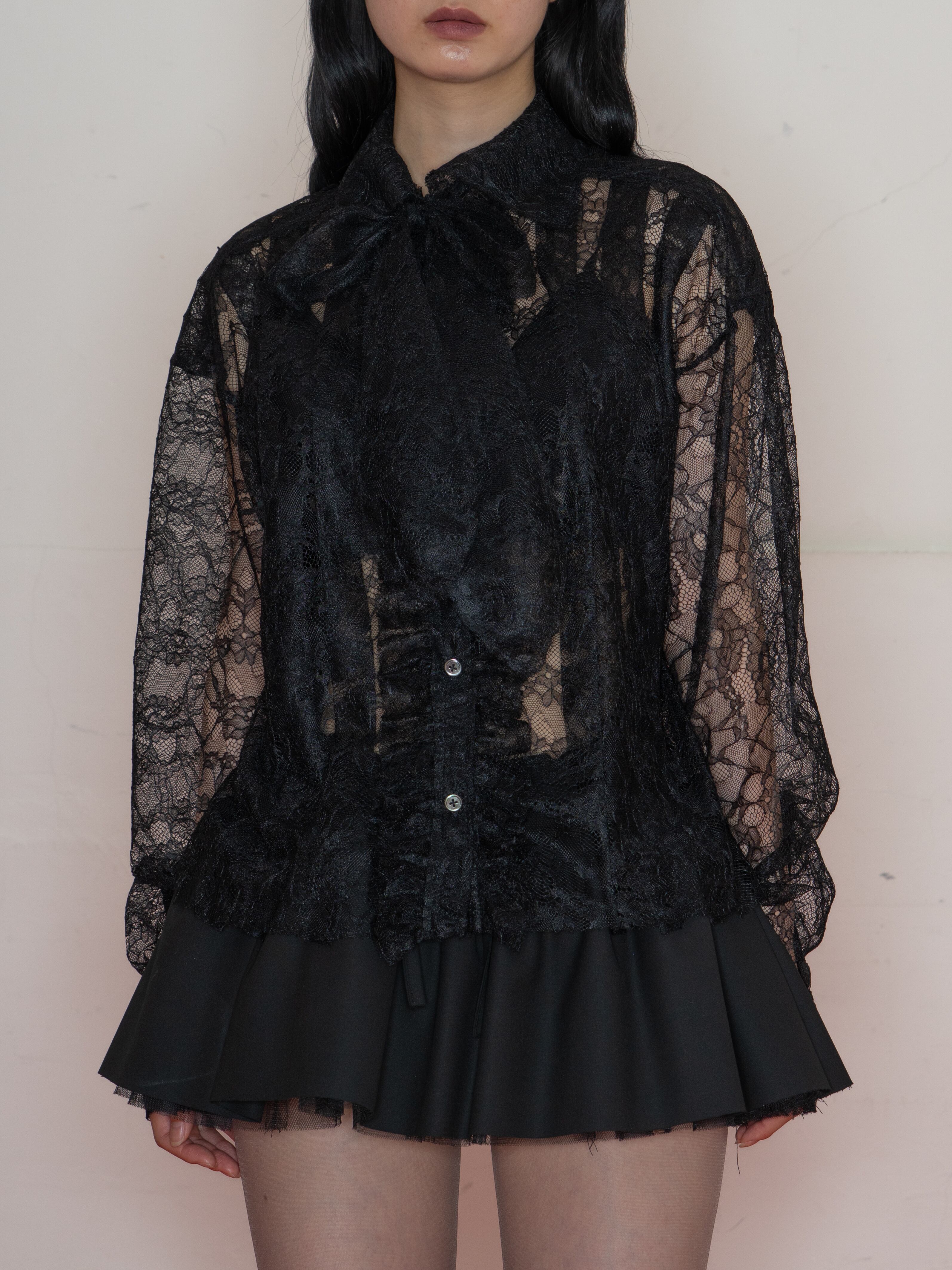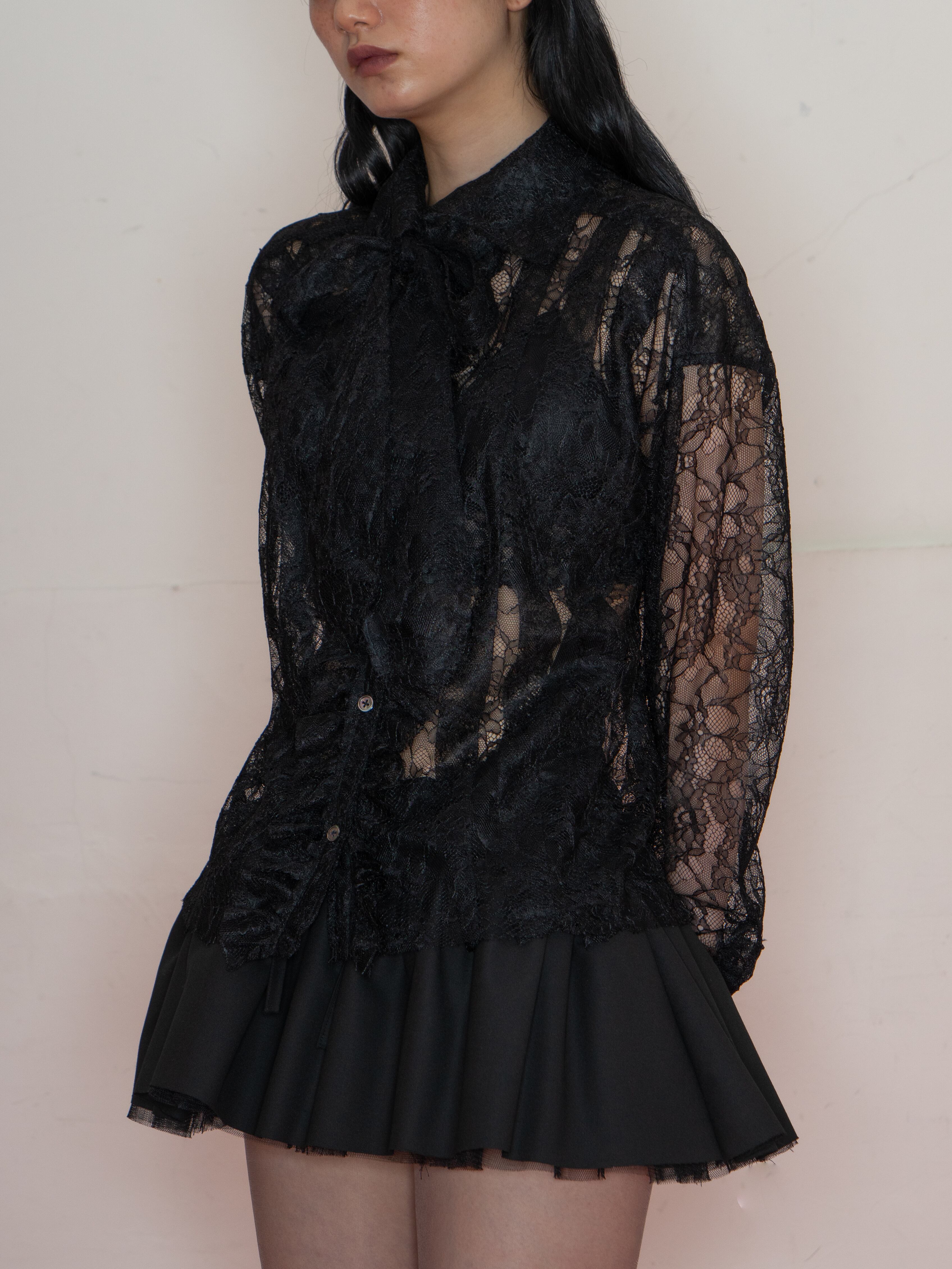 前たてのレースや、襟に沿ったリボンタイがポイント。デイリーでも着回しのしやすいアイテムです。