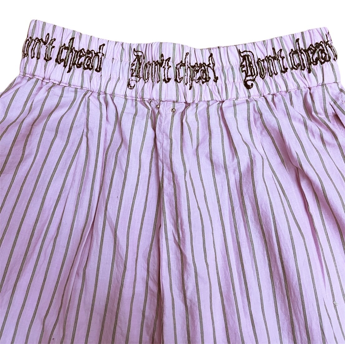 ストライプシャツと同生地のストライプTrunks pants。ベルト部分のロゴプリントがポイント。薄手の生地なのでレイヤードでも、セットアップでも春夏に使いやすいアイテムです。