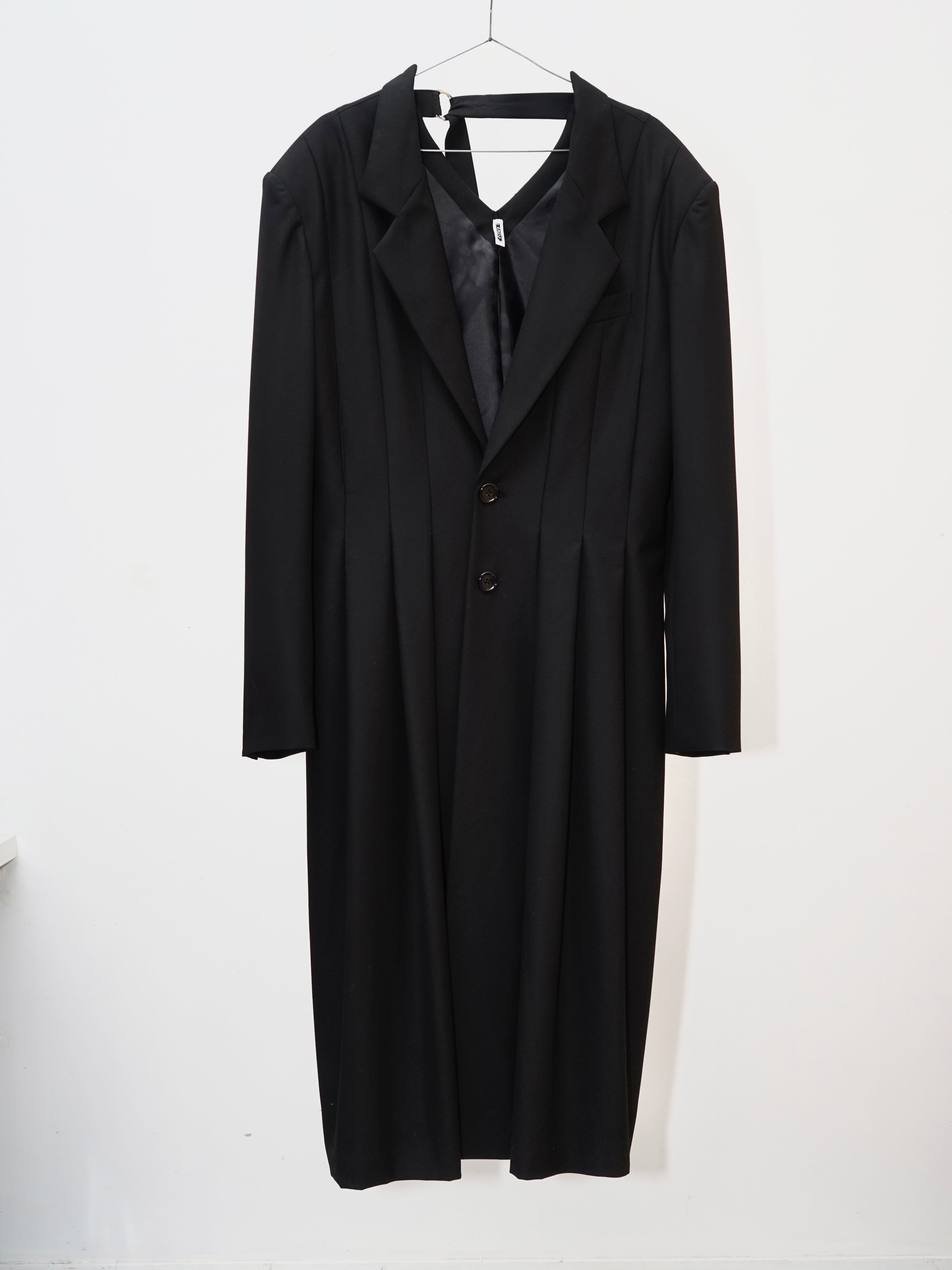 しなやかさのある上品な生地に、ドロップショルダー、emary定番のチョーカーディティールなどshapeにこだわったlong jacket。