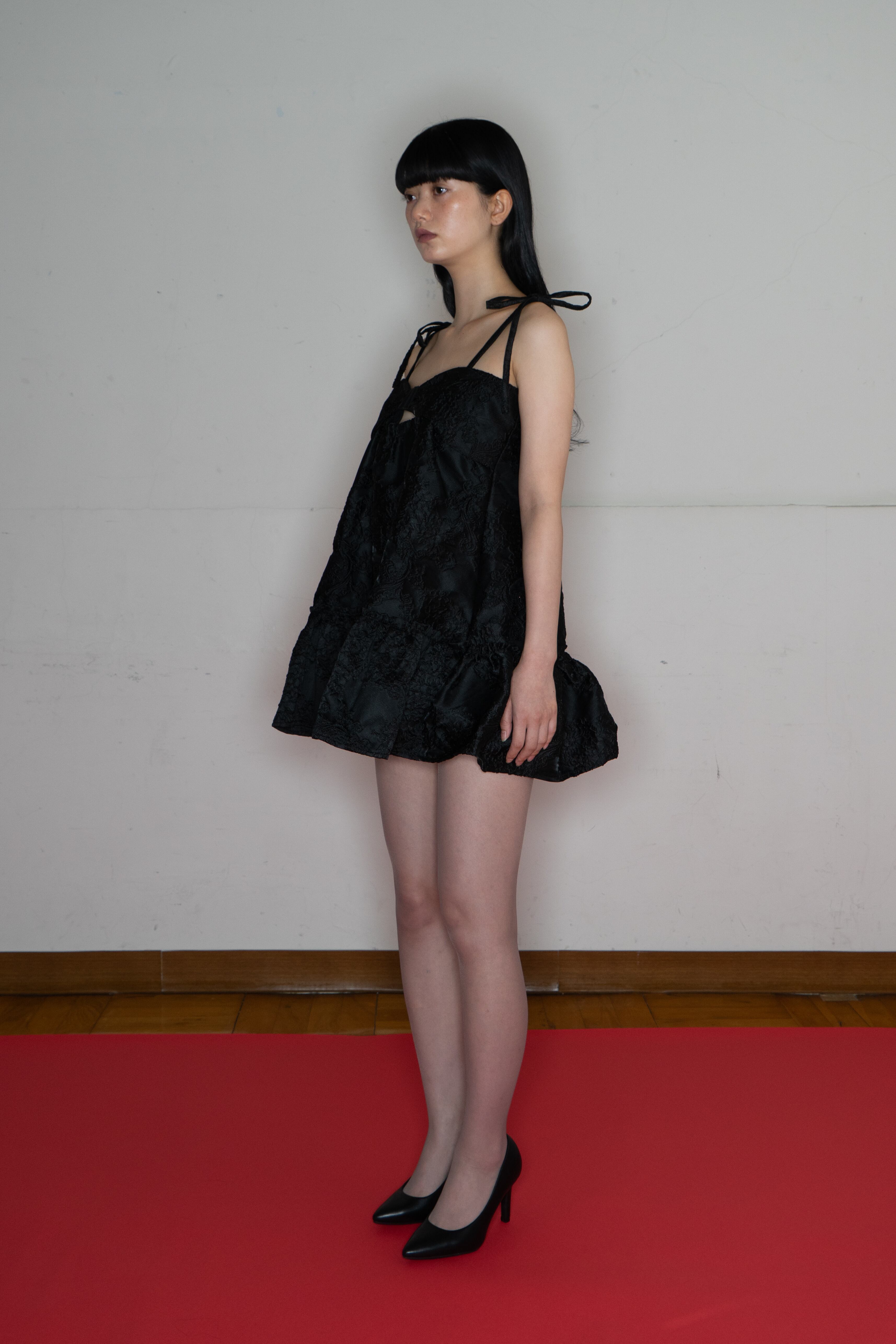 ジャガード生地を使用しておりcuteなshapeのリボンドレス。肩紐で長さが調節可能。