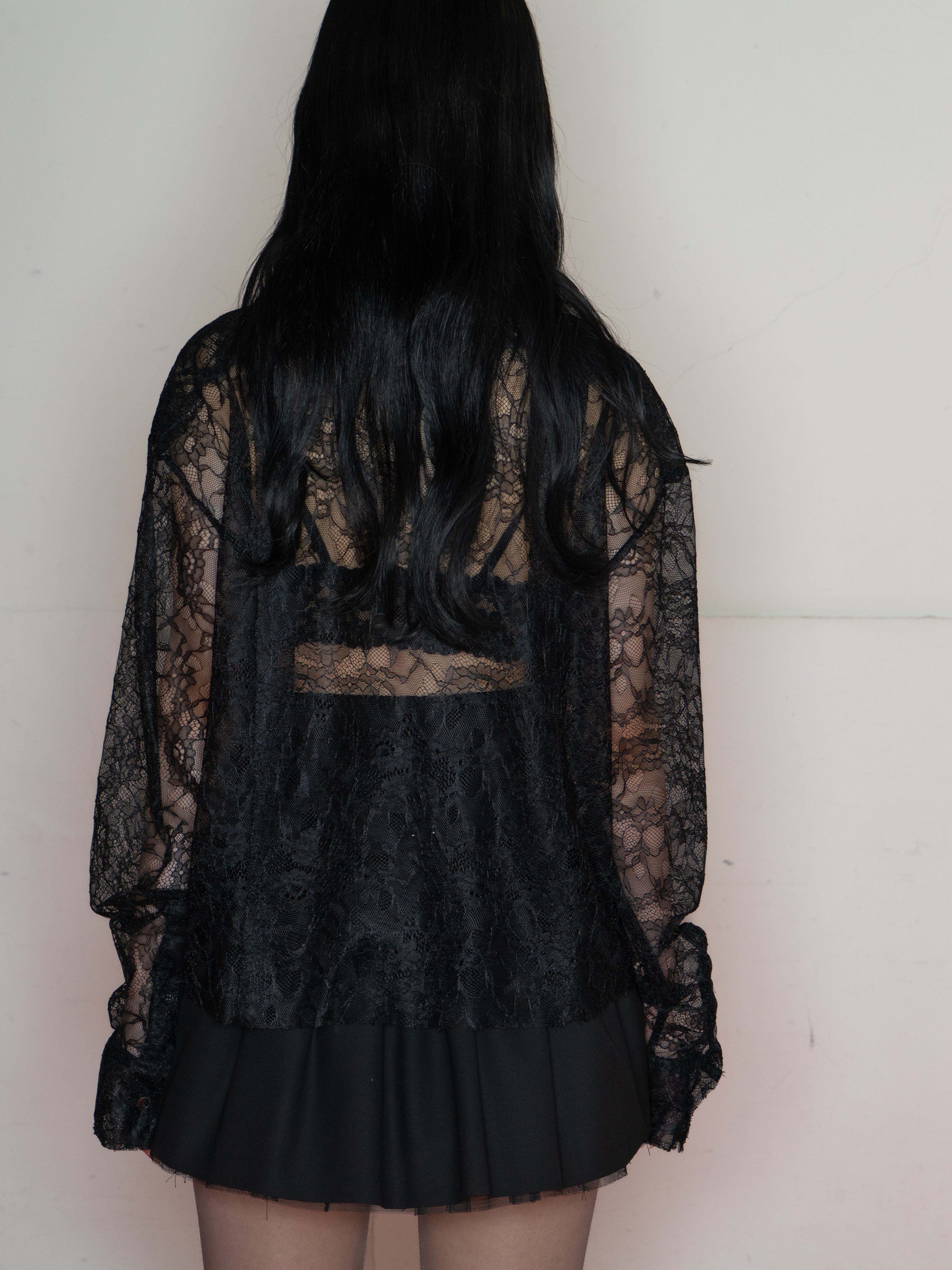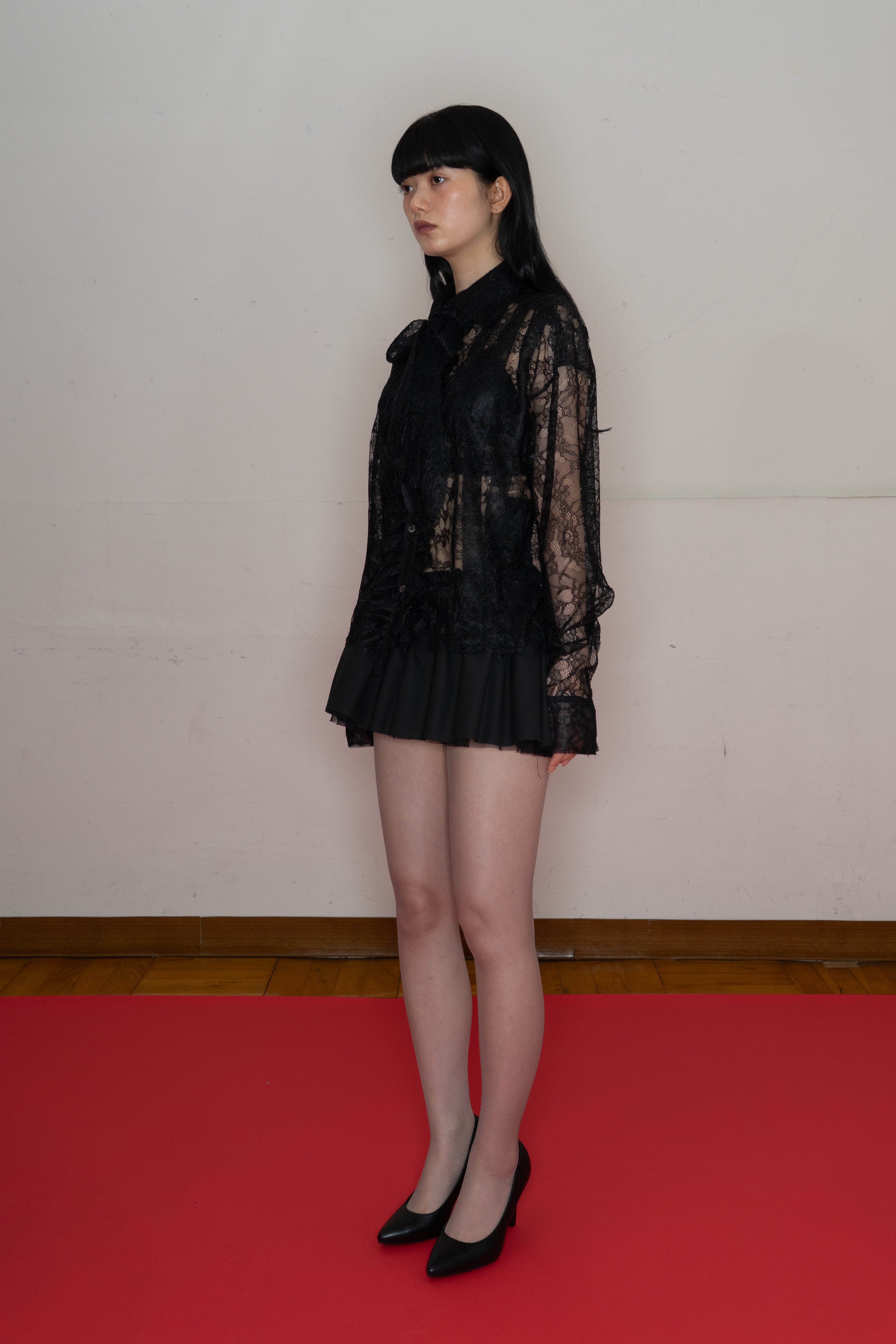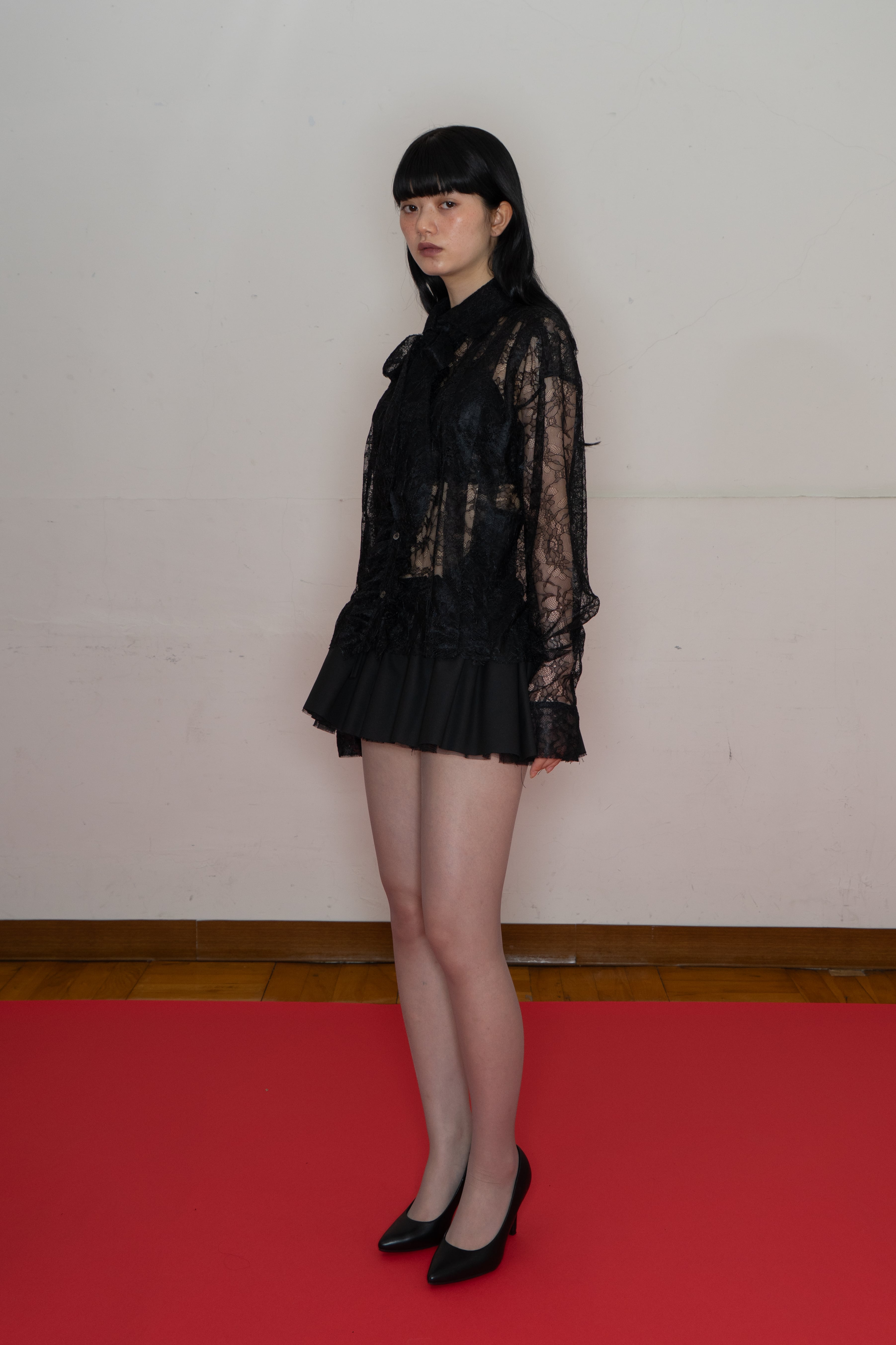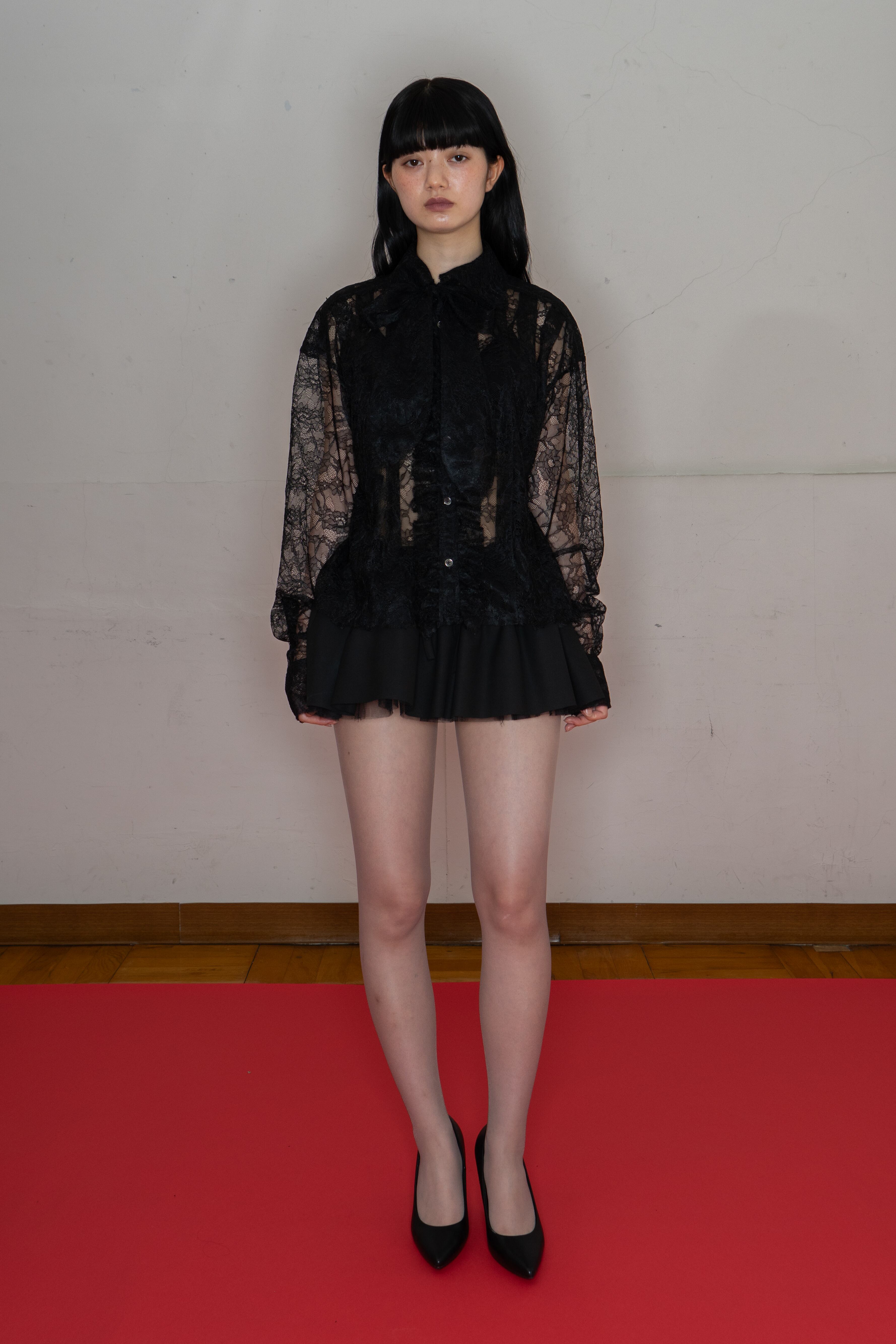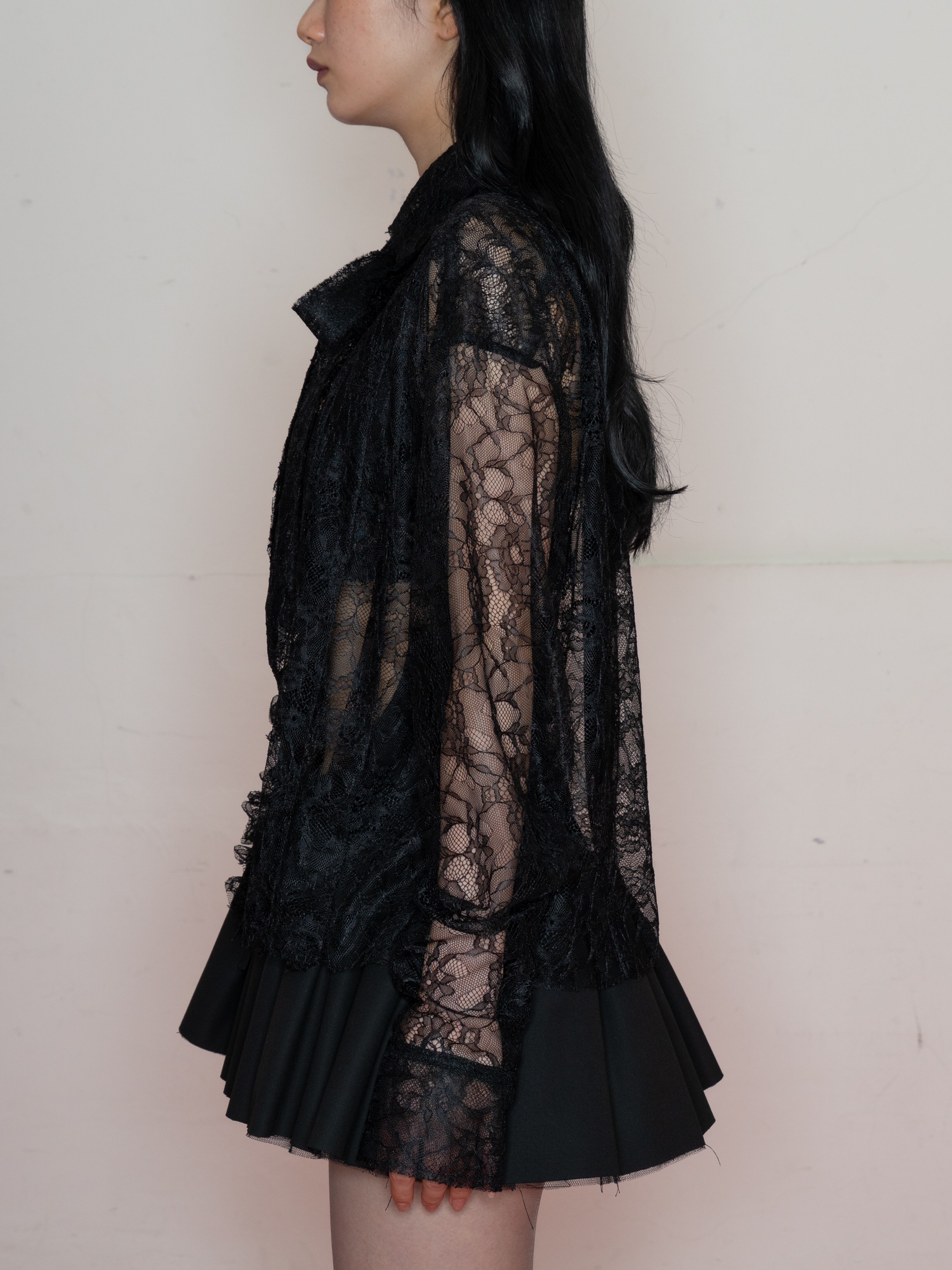 前たてのレースや、襟に沿ったリボンタイがポイント。デイリーでも着回しのしやすいアイテムです。
