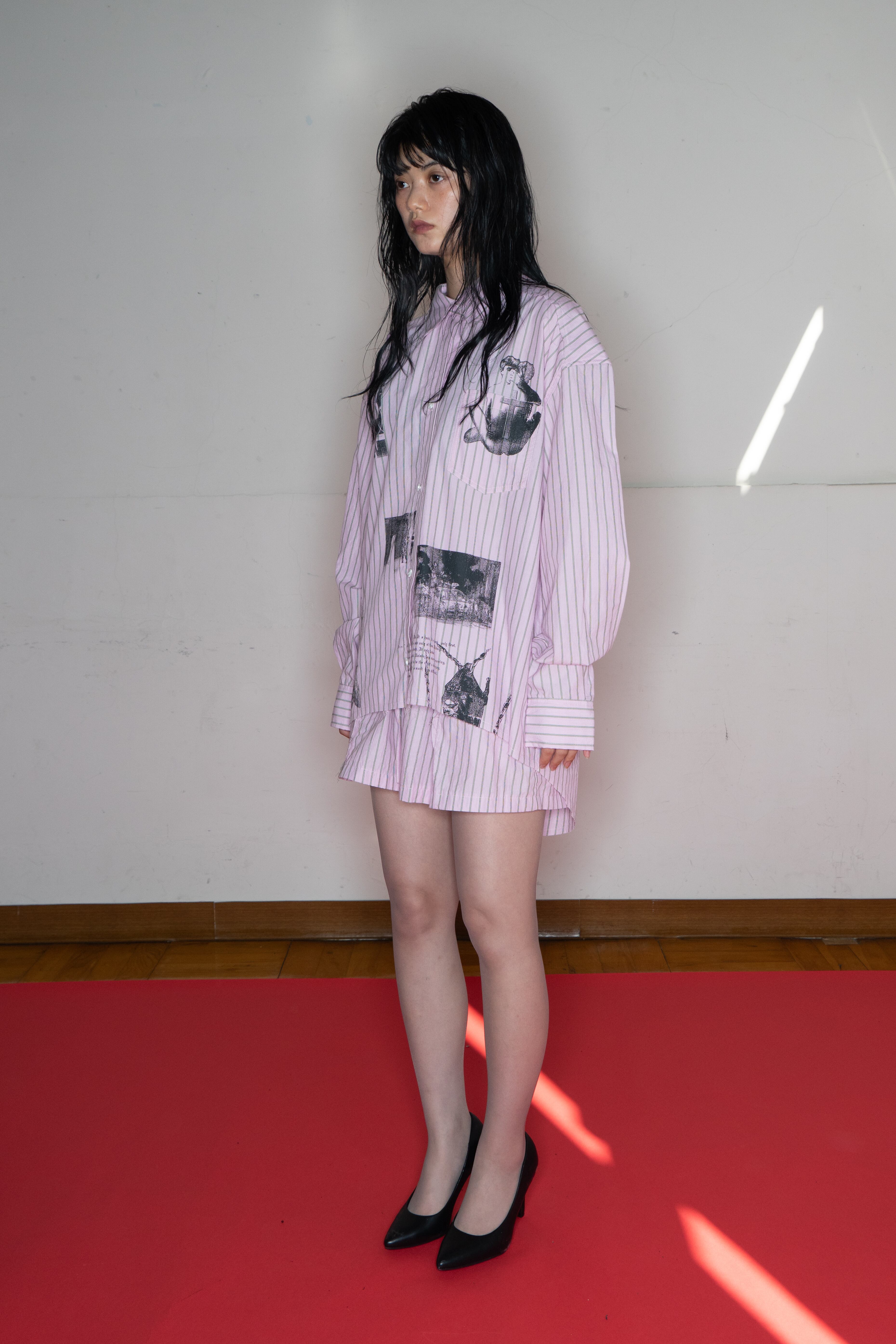 26SSのメイングラフィックがプリントされたストライプシャツ。