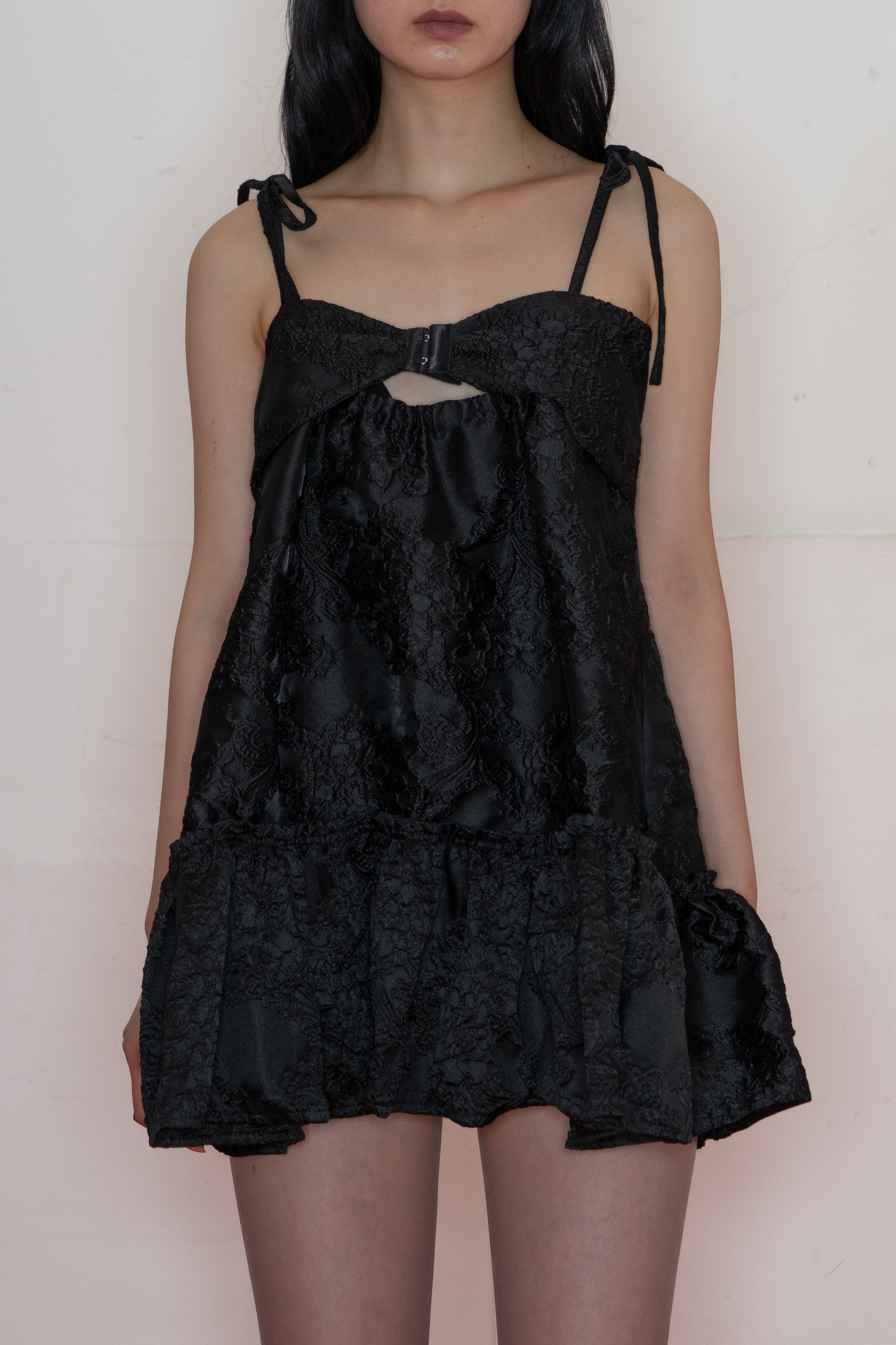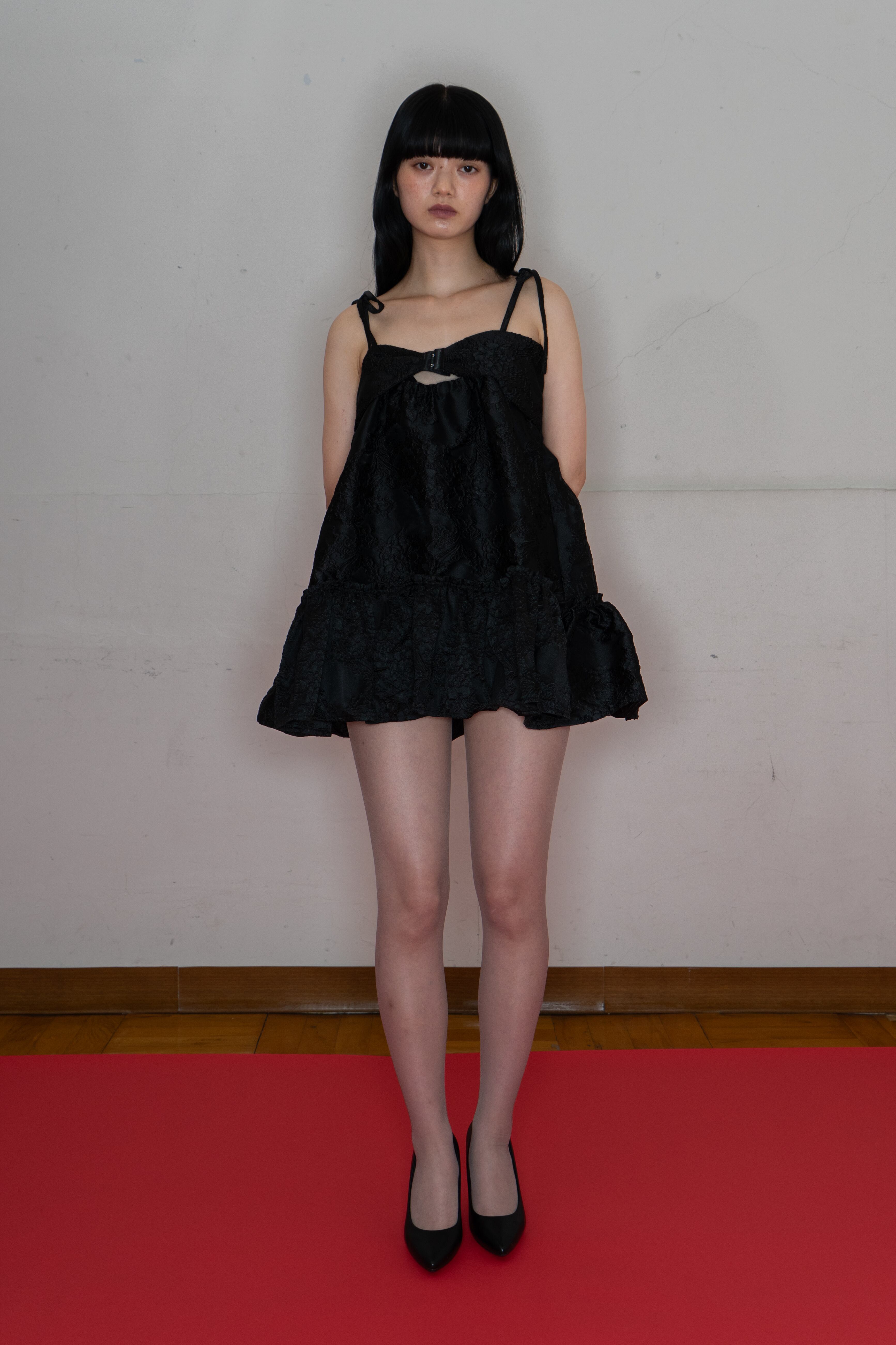 ジャガード生地を使用しておりcuteなshapeのリボンドレス。肩紐で長さが調節可能。