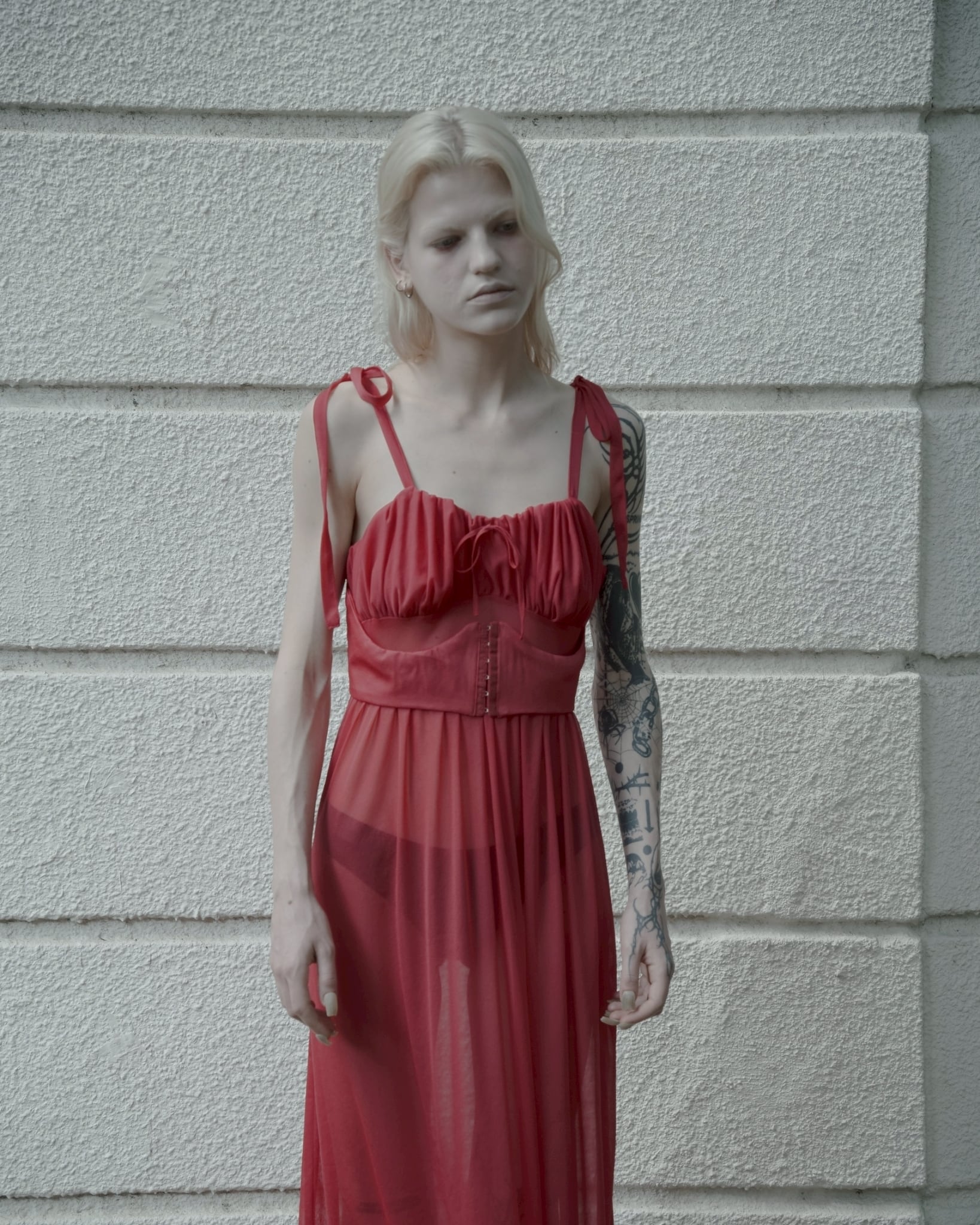シアー素材が軽やかなコルセット付きワンピース。細かいディティールにこだわった1着です。