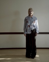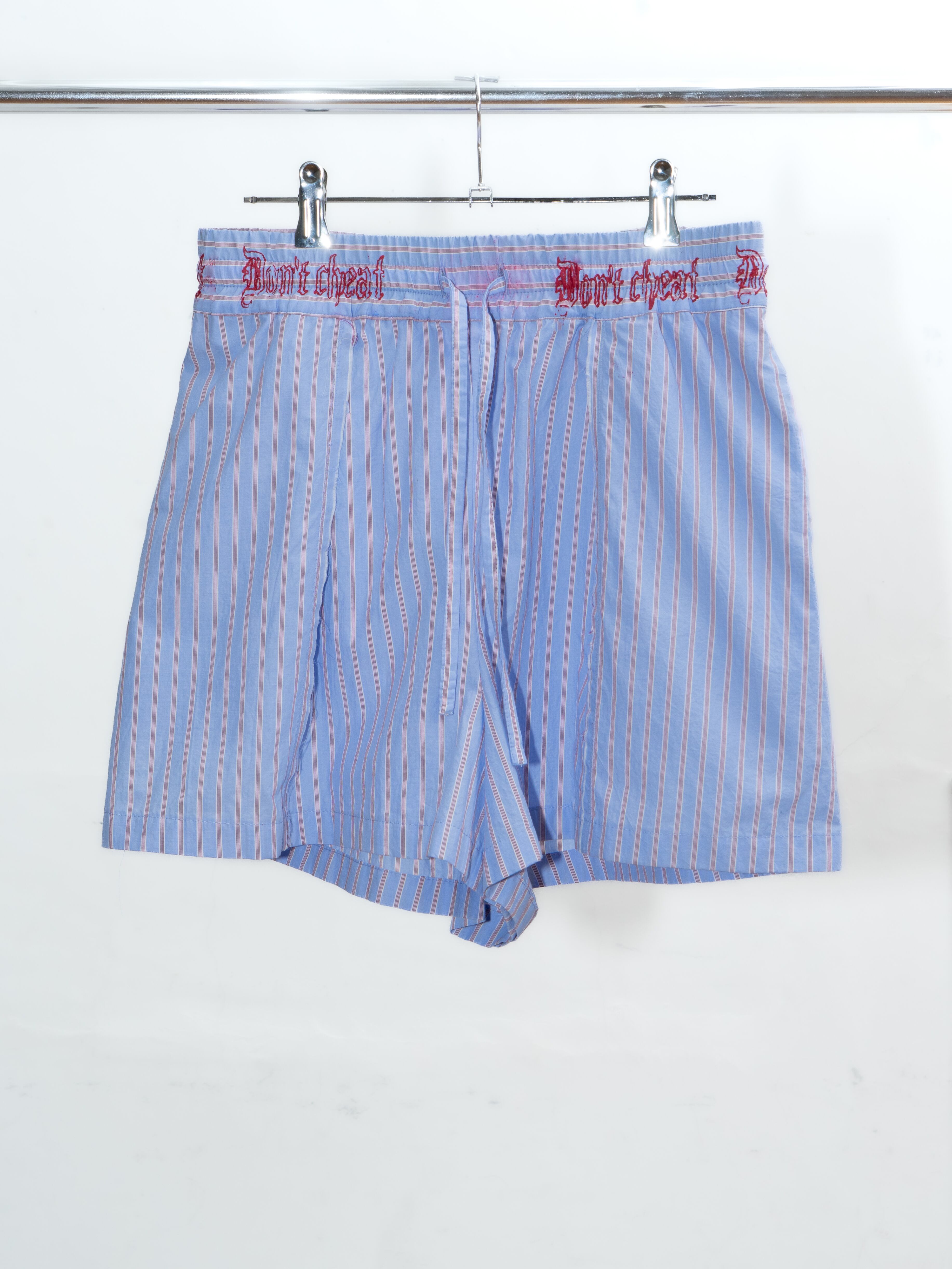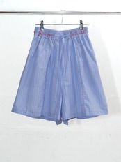 ストライプシャツと同生地のストライプTrunks pants。ベルト部分のロゴプリントがポイント。薄手の生地なのでレイヤードでも、セットアップでも春夏に使いやすいアイテムです。