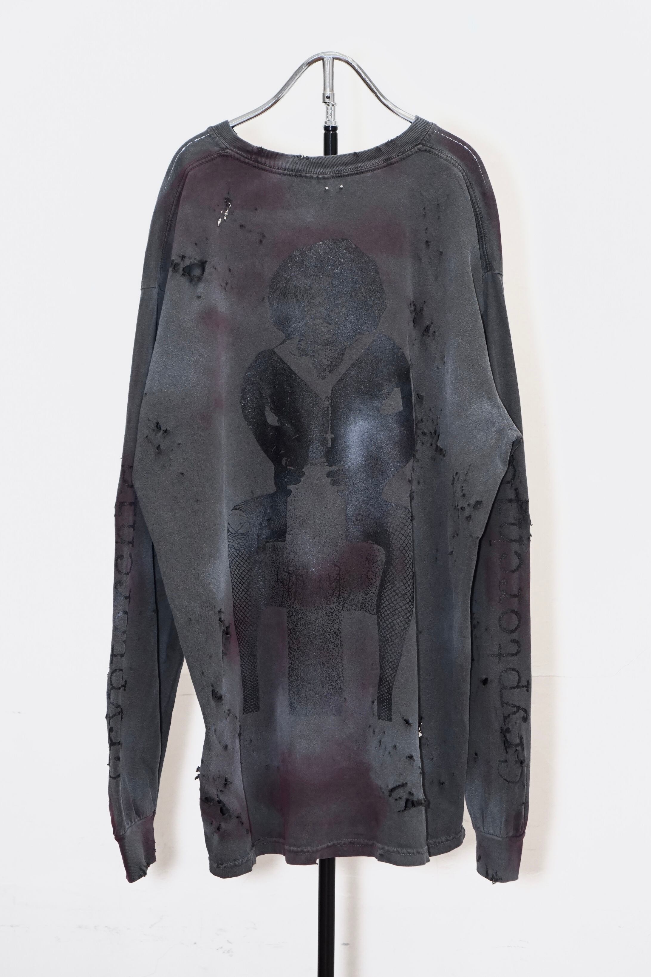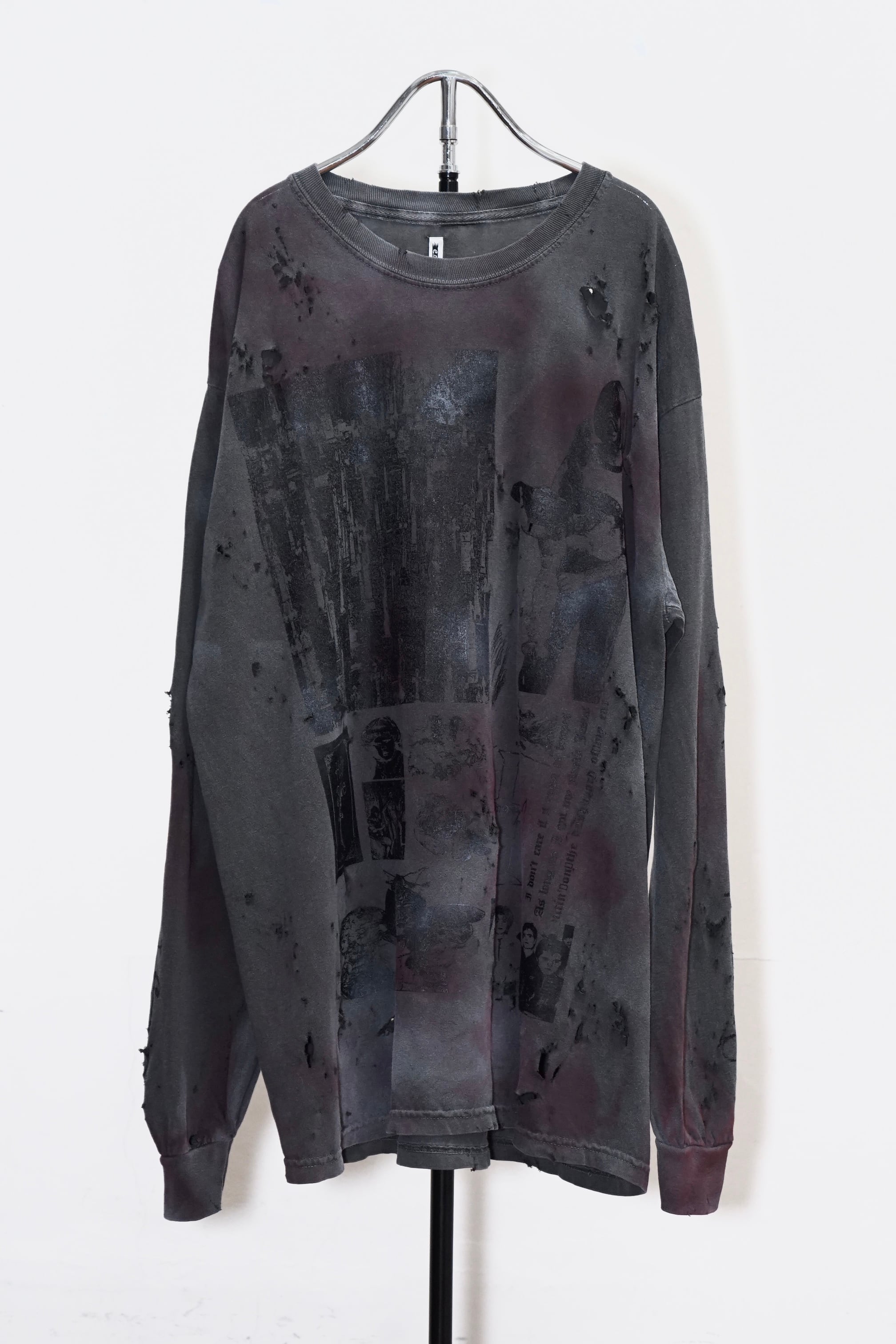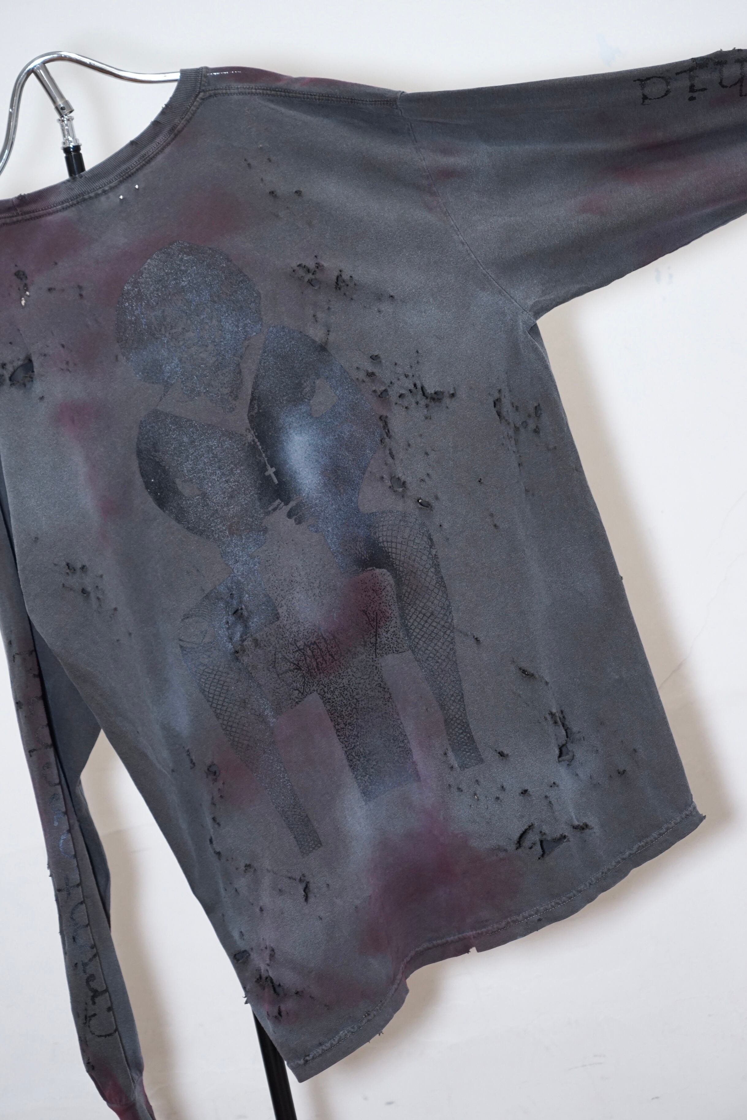 コレクションのimageを象徴するグラフィックロングTシャツ。ロングTはTシャツのバックプリントがフロントデザインになっています。こちらはダメージ、顔料加工のあるverです。XLのサイズ感でユニセックスでご着用いただけます。※ダメージ、顔良加工はあくまでもイメージとなります。個体差がございますのでご了承くださいませ。