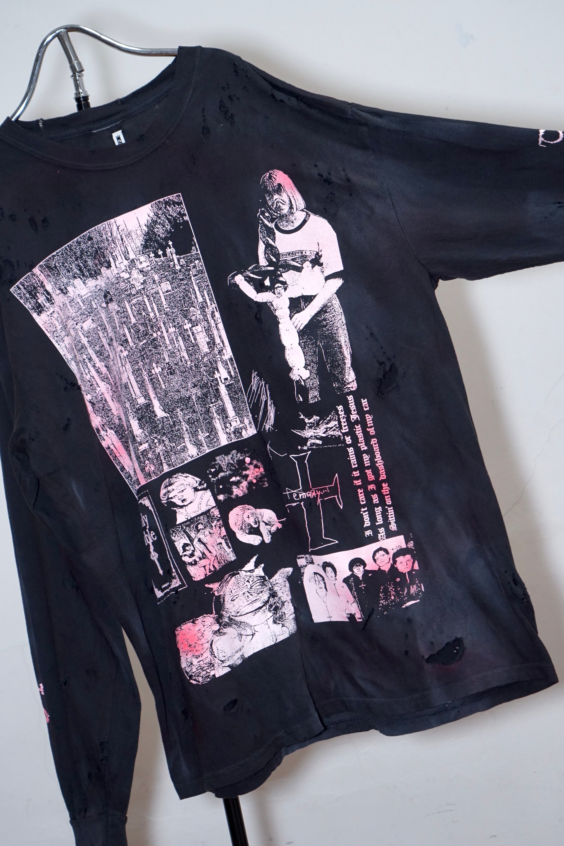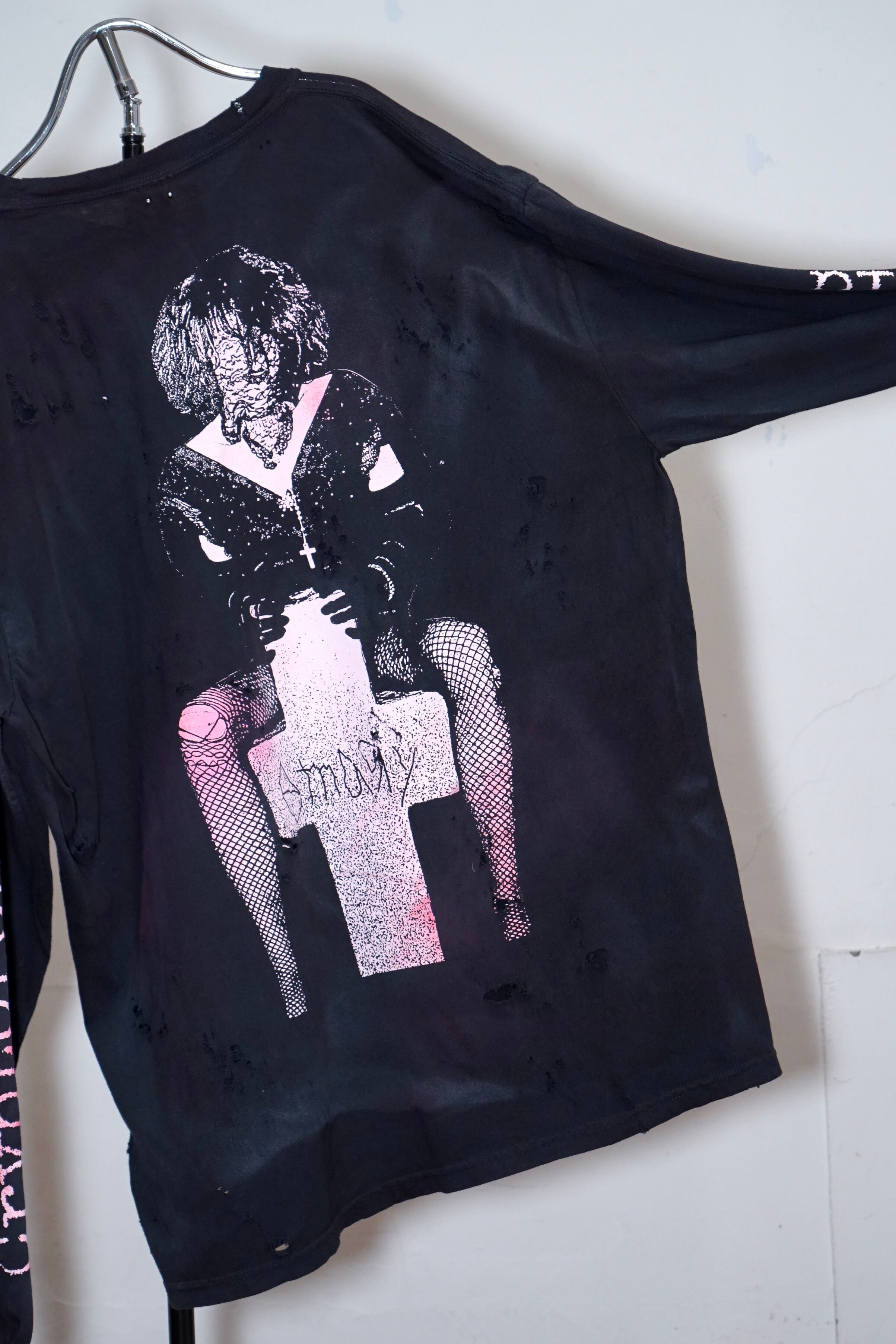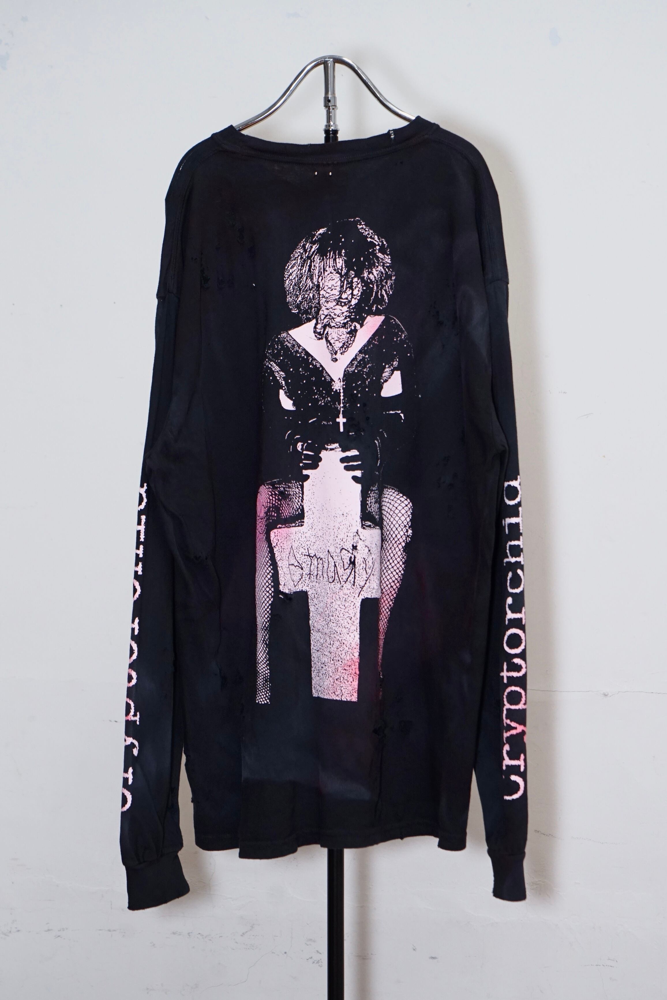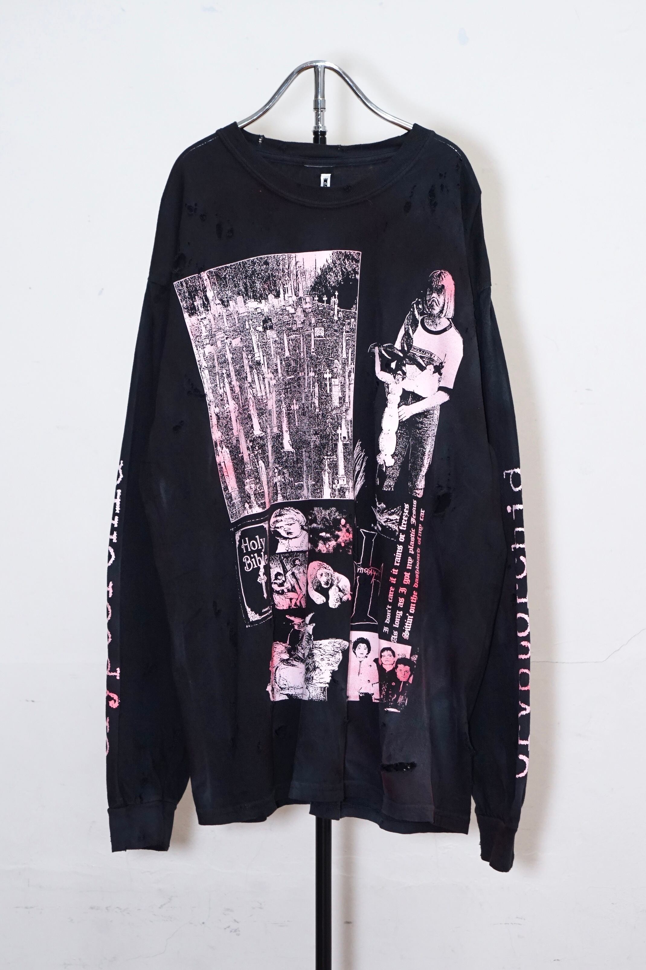 コレクションのimageを象徴するグラフィックロングTシャツ。BlackにBaby pinkのインク配色です。ロングTはTシャツのバックプリントがフロントデザインになっています。こちらはダメージ、顔料加工のあるverです。XLのサイズ感でユニセックスでご着用いただけます。※ダメージ、顔良加工はあくまでもイメージとなります。個体差がございますのでご了承くださいませ。