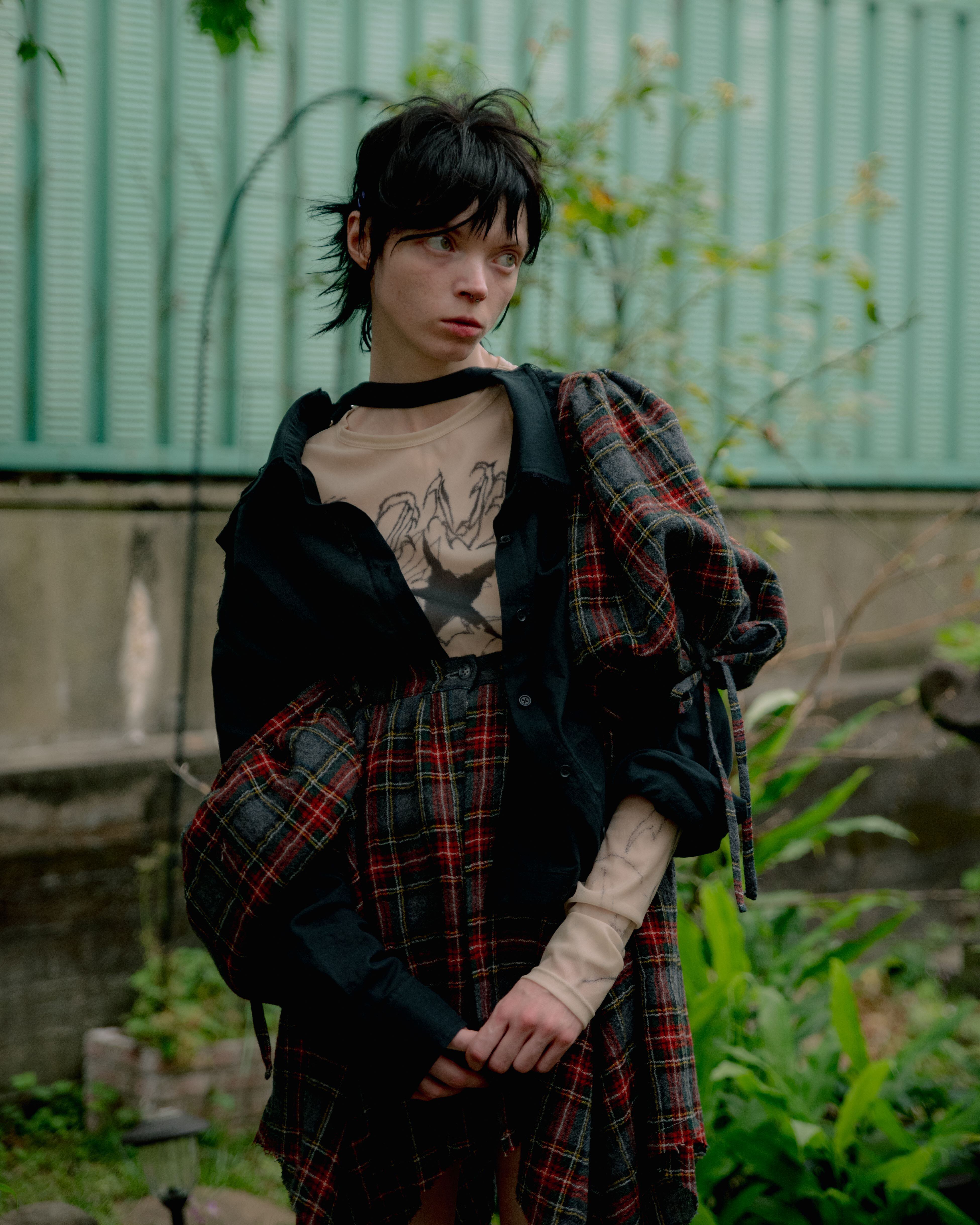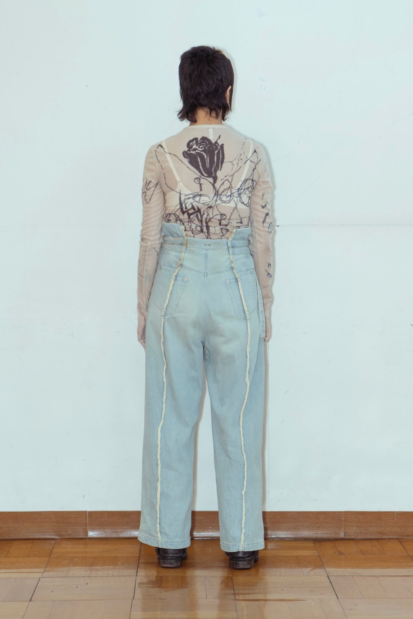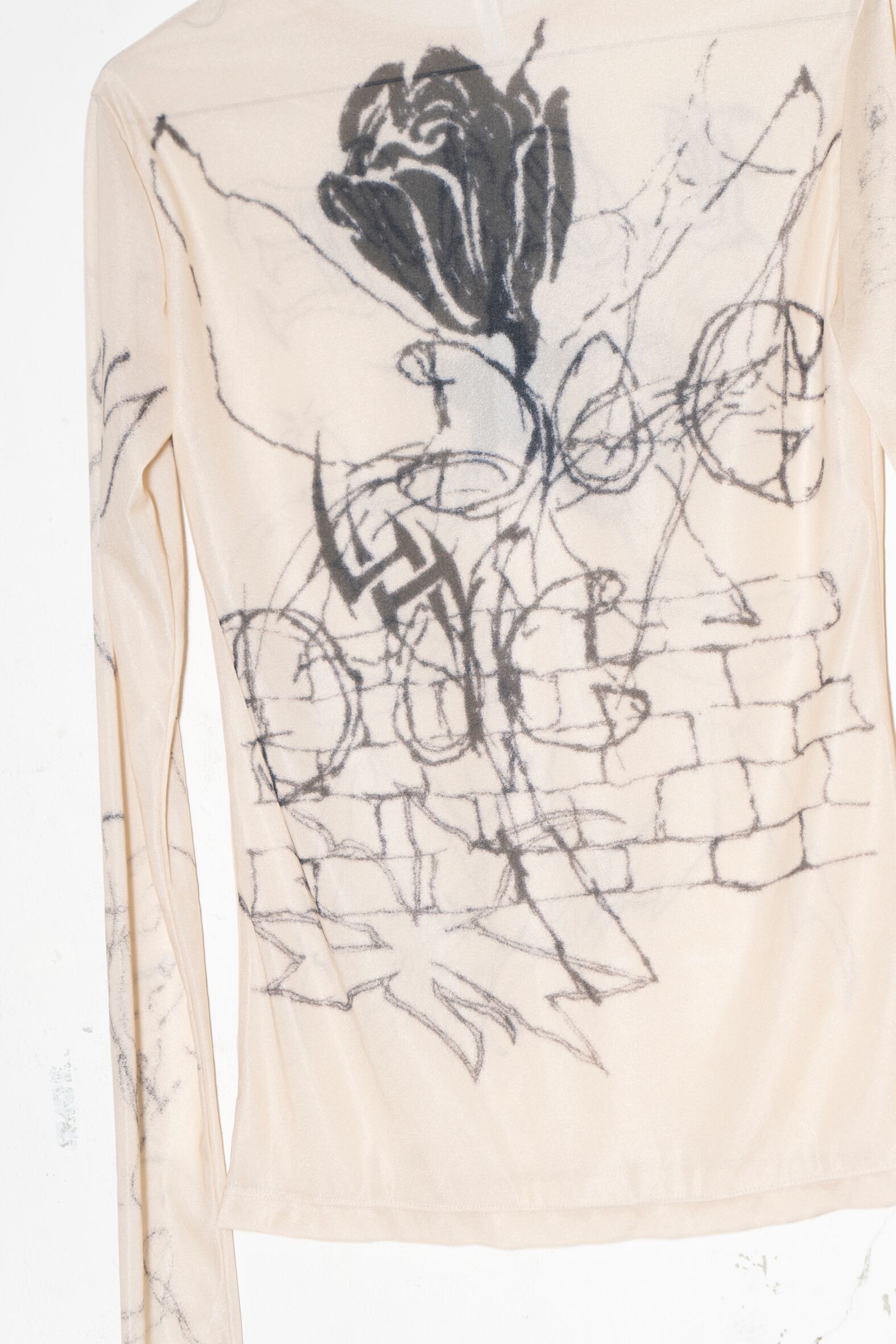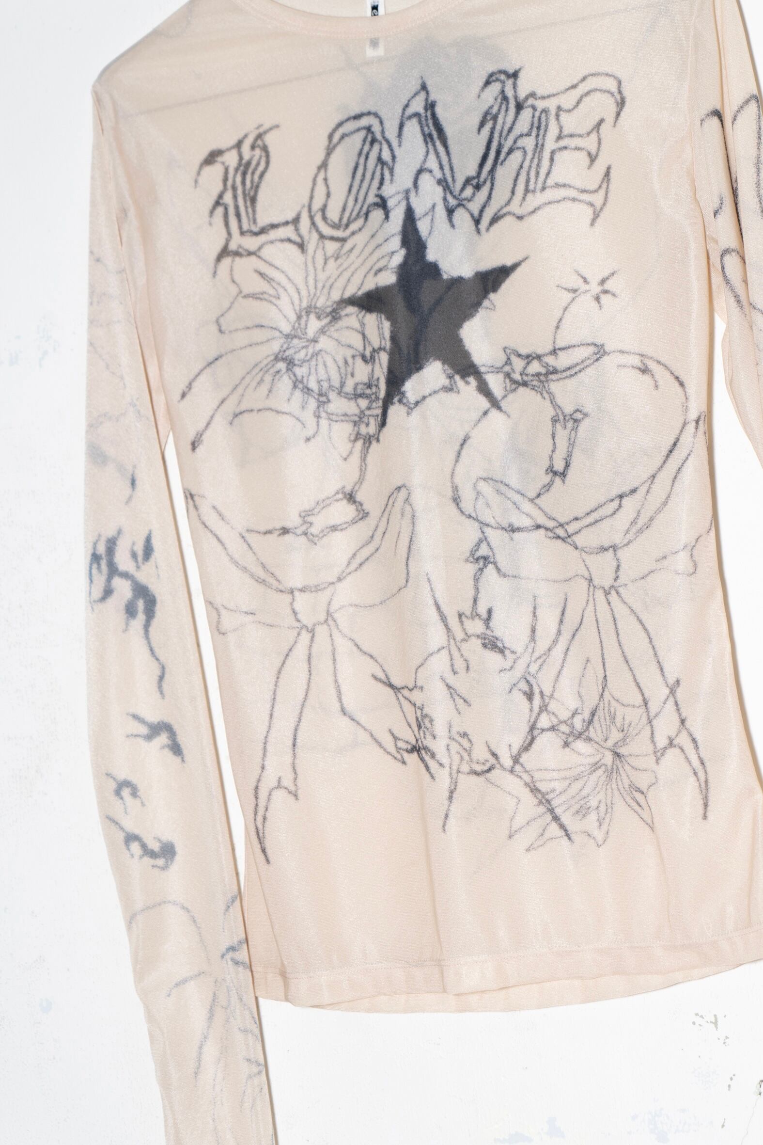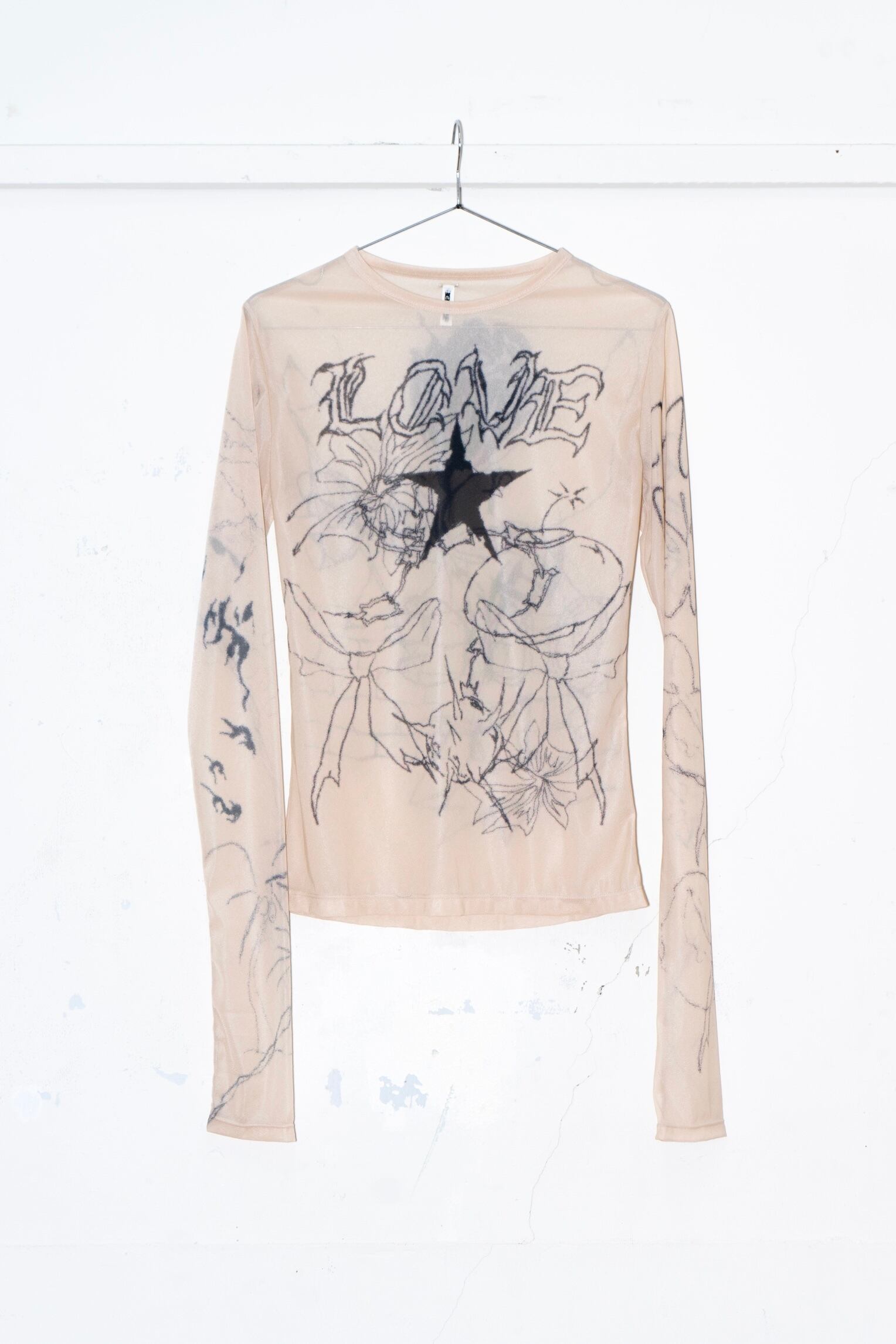 透け感のあるストレッチ素材を使用したtops。tattooモチーフのプリントが映える1着。2size展開で、Msizeはユニセックスでご着用いただけます。※モデル着用はS sizeです