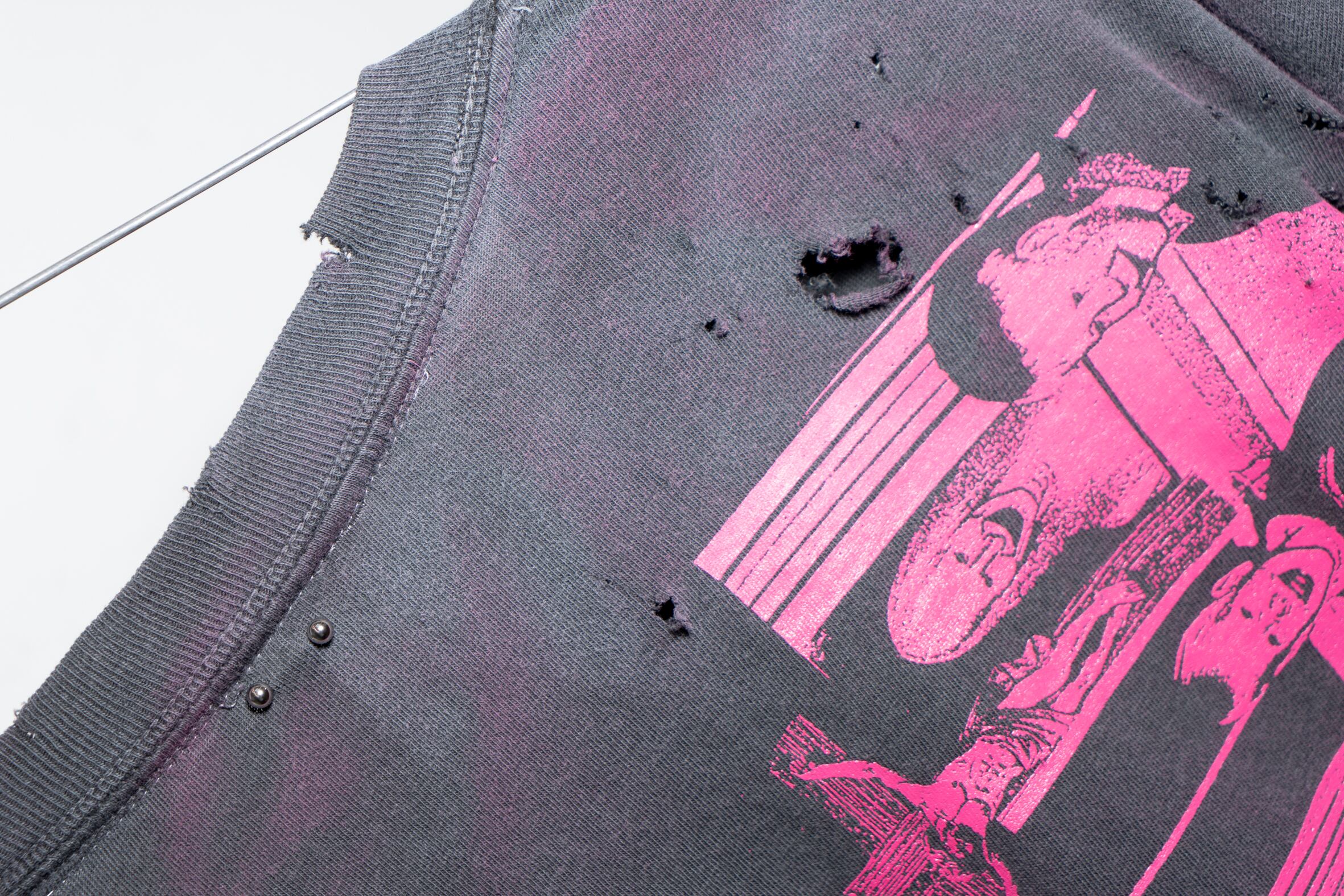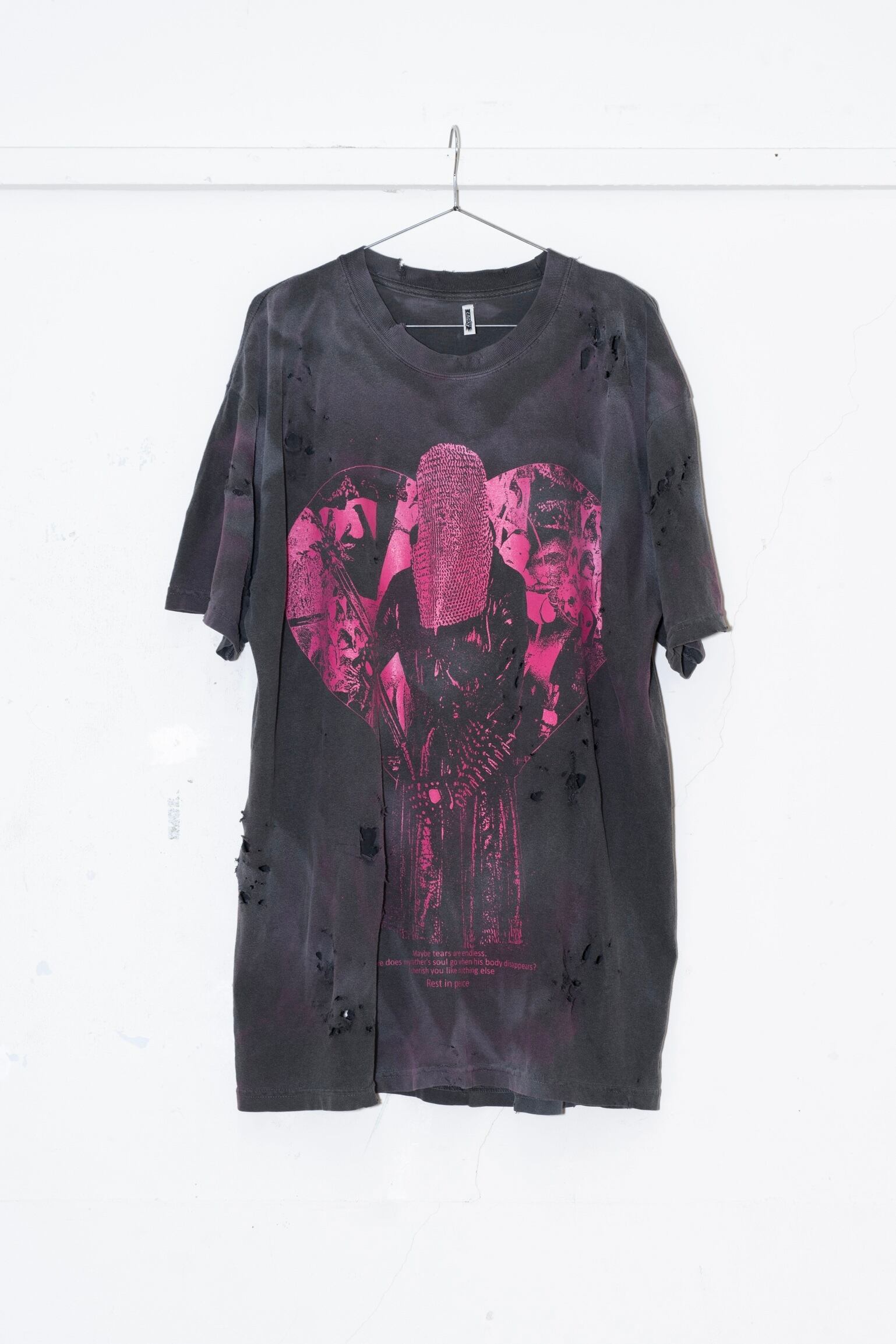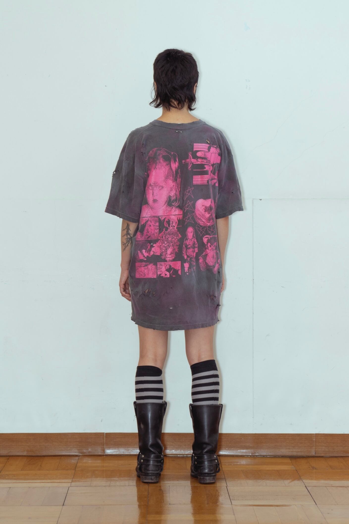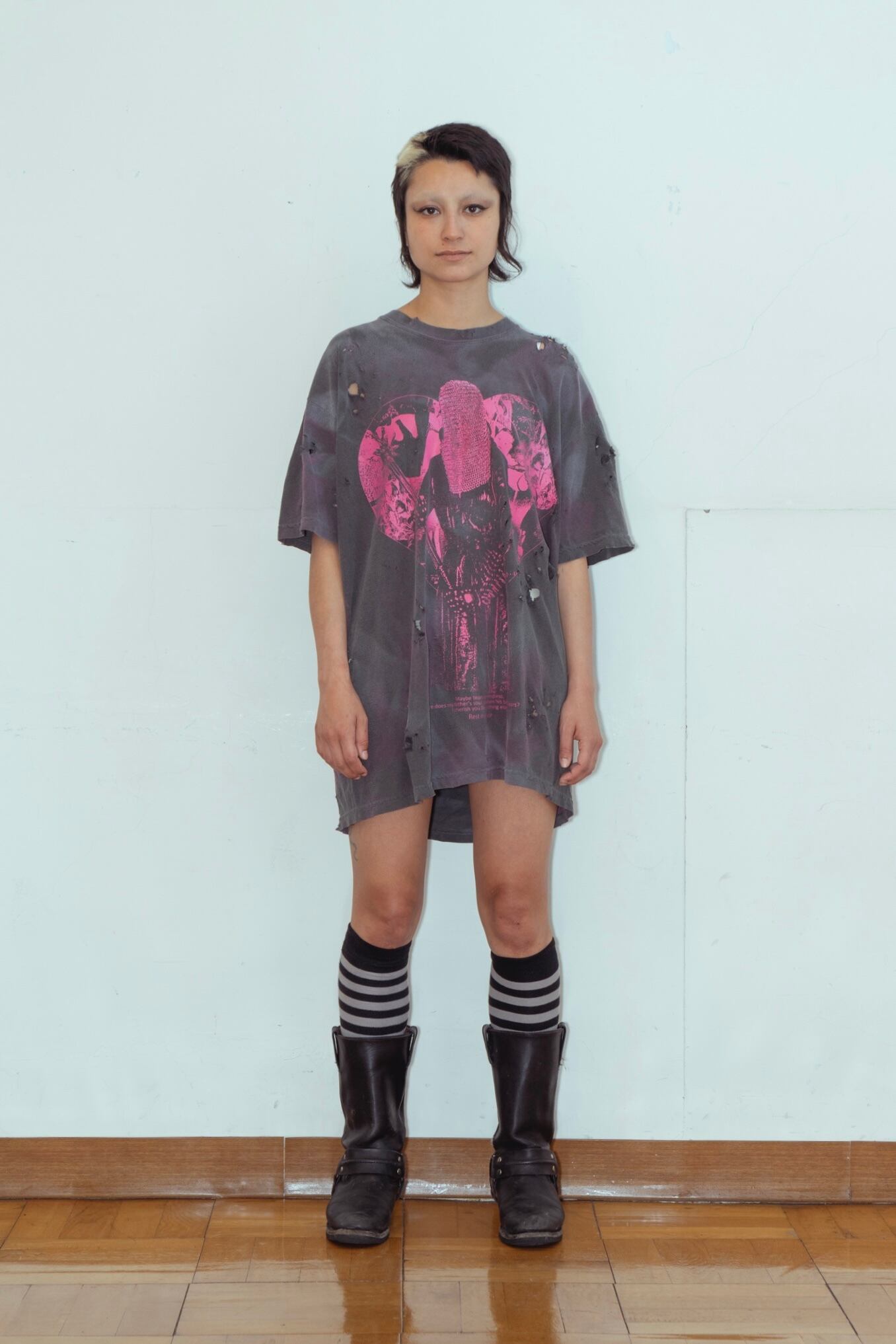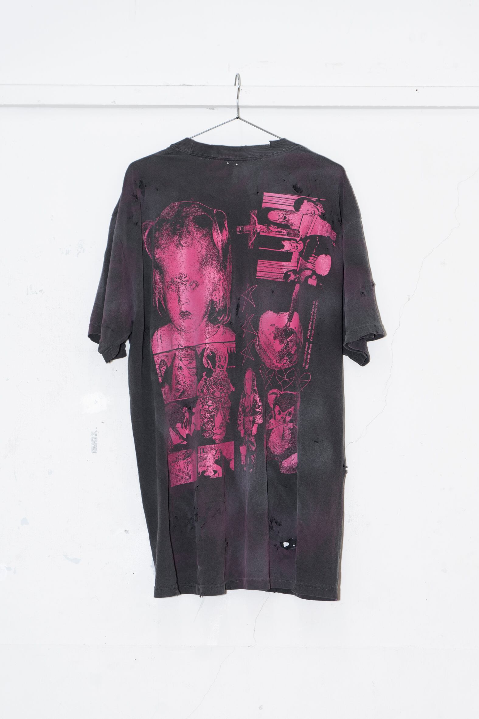 コレクションのimageを象徴するグラフィックTシャツ。こちらはダメージ、顔料加工のあるverです。XLのサイズ感でユニセックスでご着用いただけます。※ダメージ、顔料加工はあくまでもイメージとなります。個体差がございますのでご了承くださいませ。
