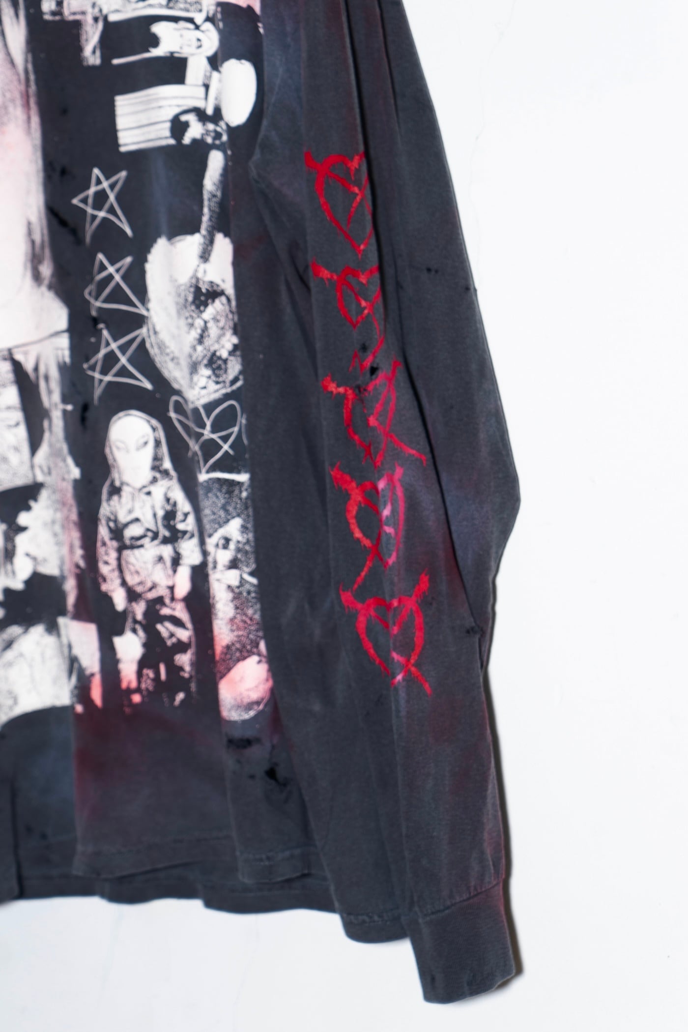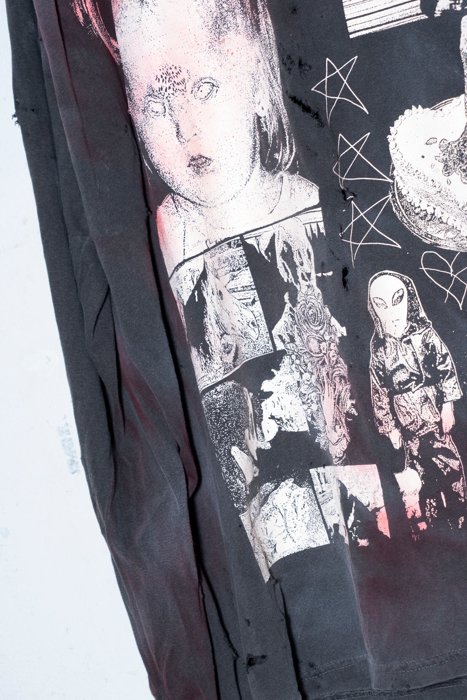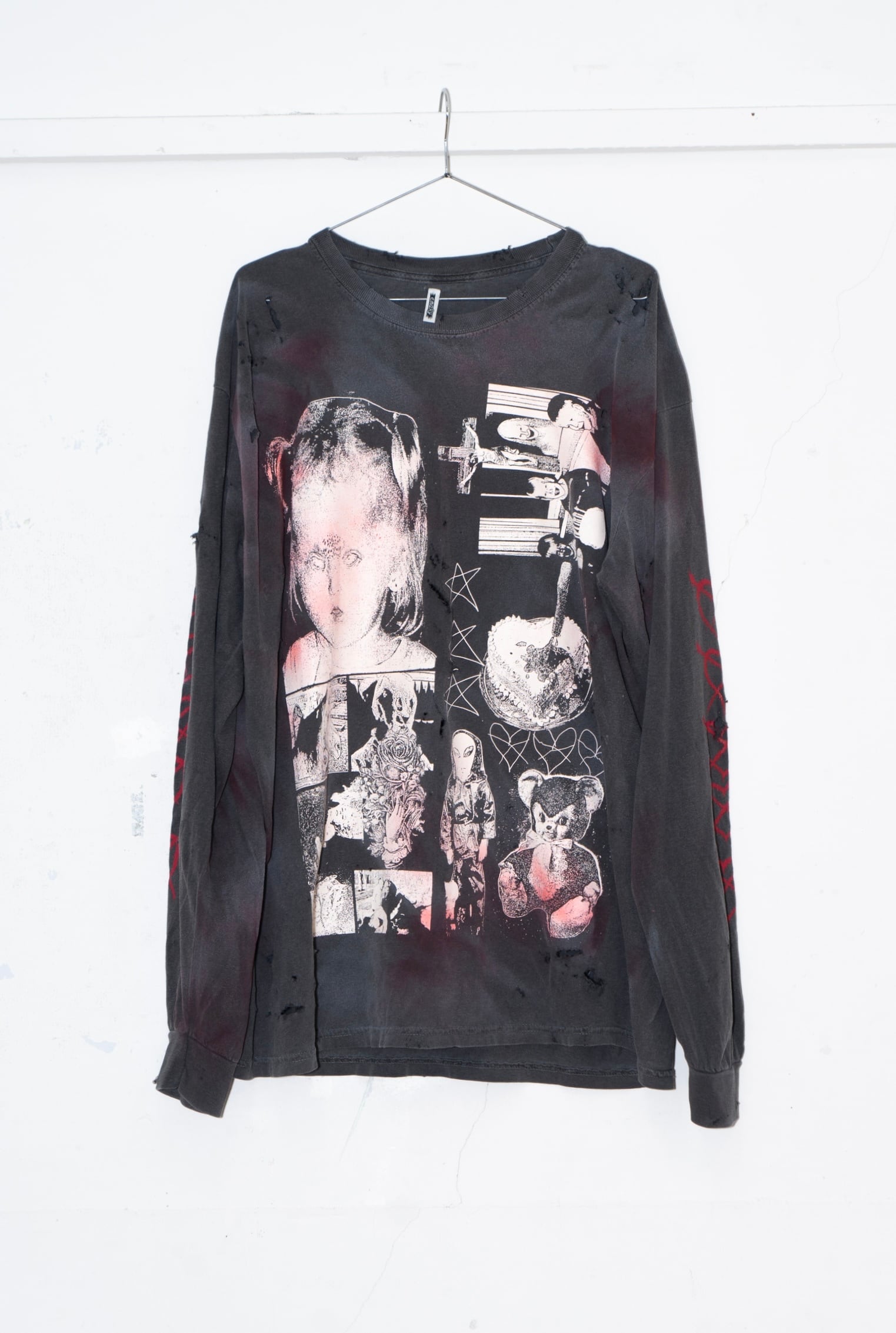 コレクションのimageを象徴するグラフィックロングTシャツ。ロングTはTシャツのバックプリントがフロントデザインになっています。こちらはダメージ、顔料加工のあるverです。XLのサイズ感でユニセックスでご着用いただけます。※ダメージ、顔料加工はあくまでもイメージとなります。個体差がございますのでご了承くださいませ。