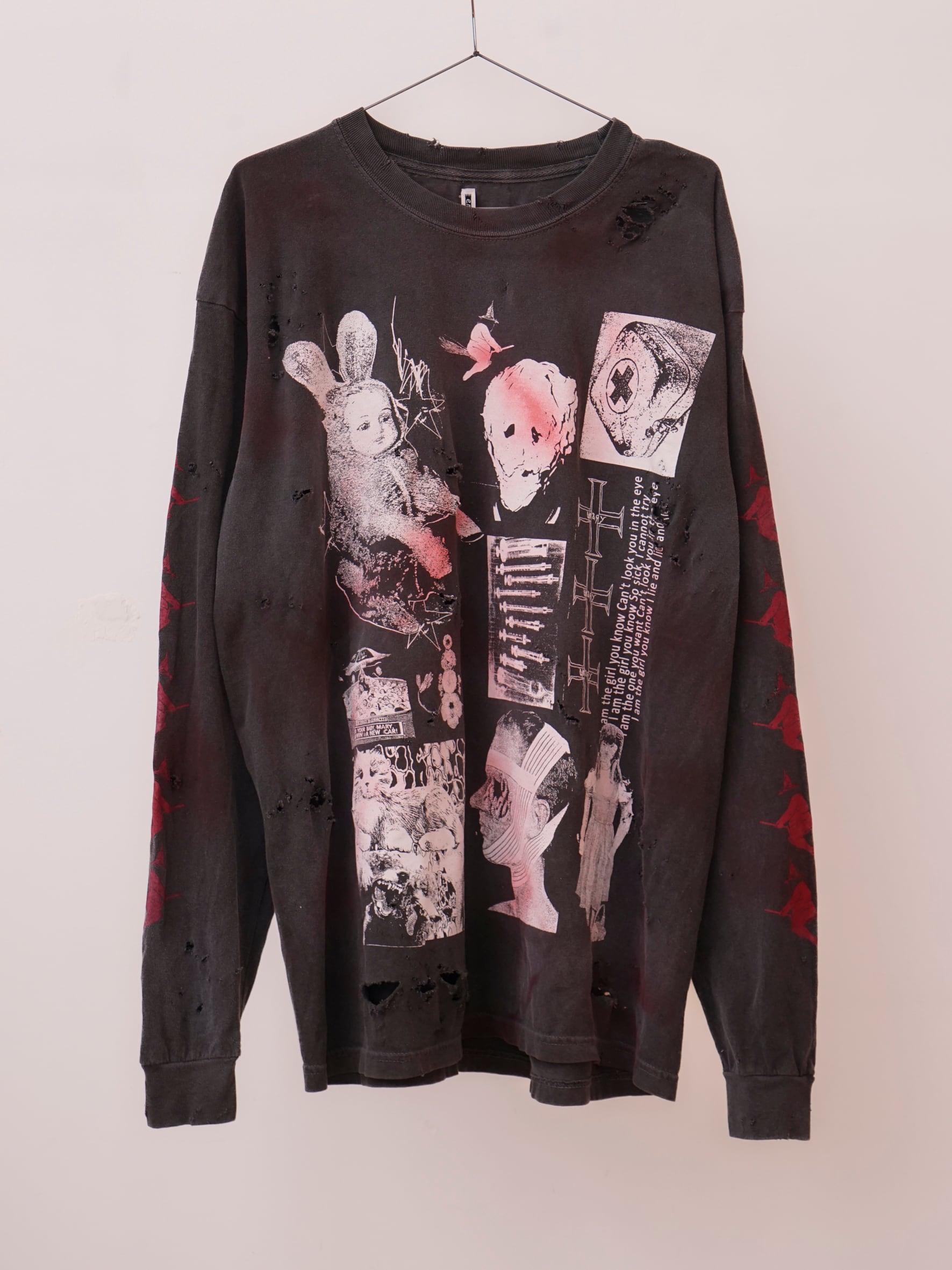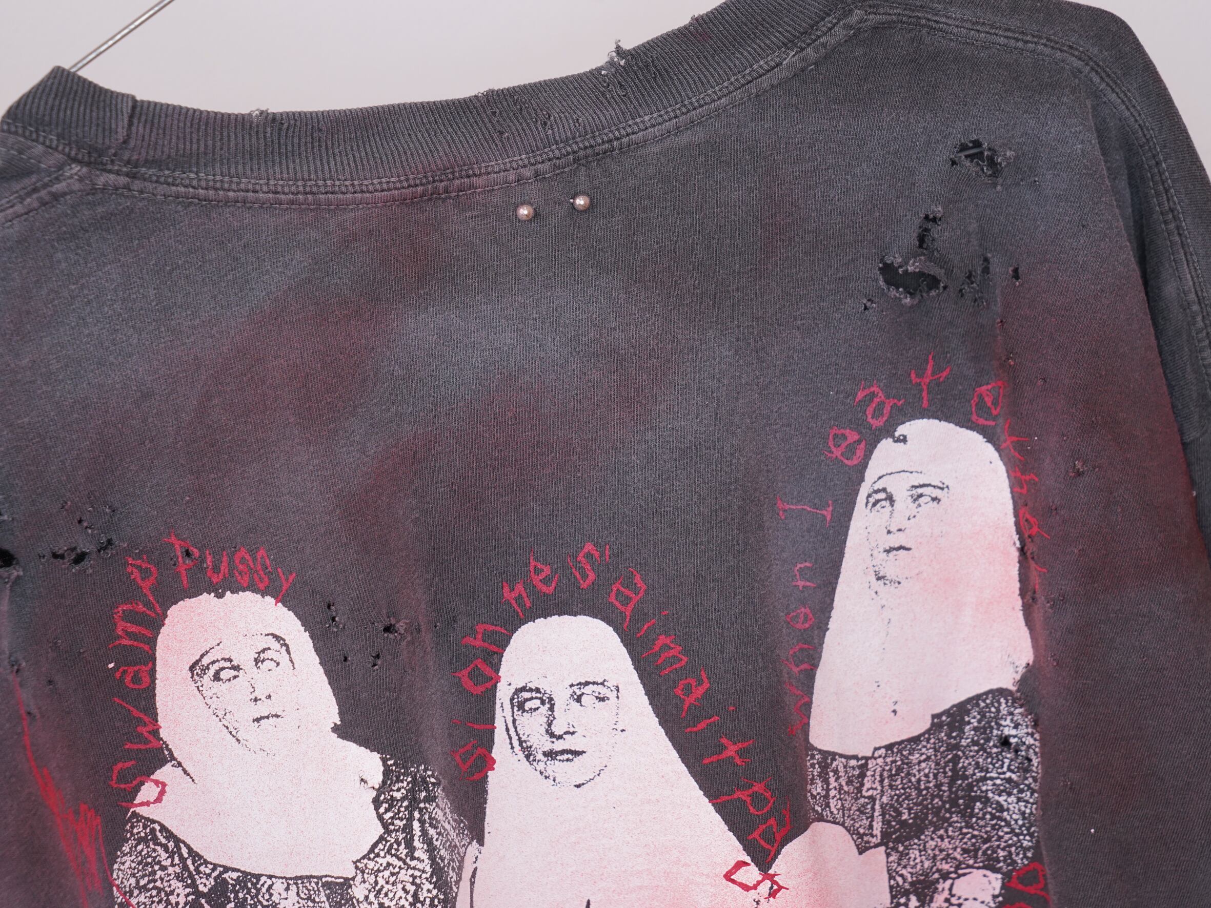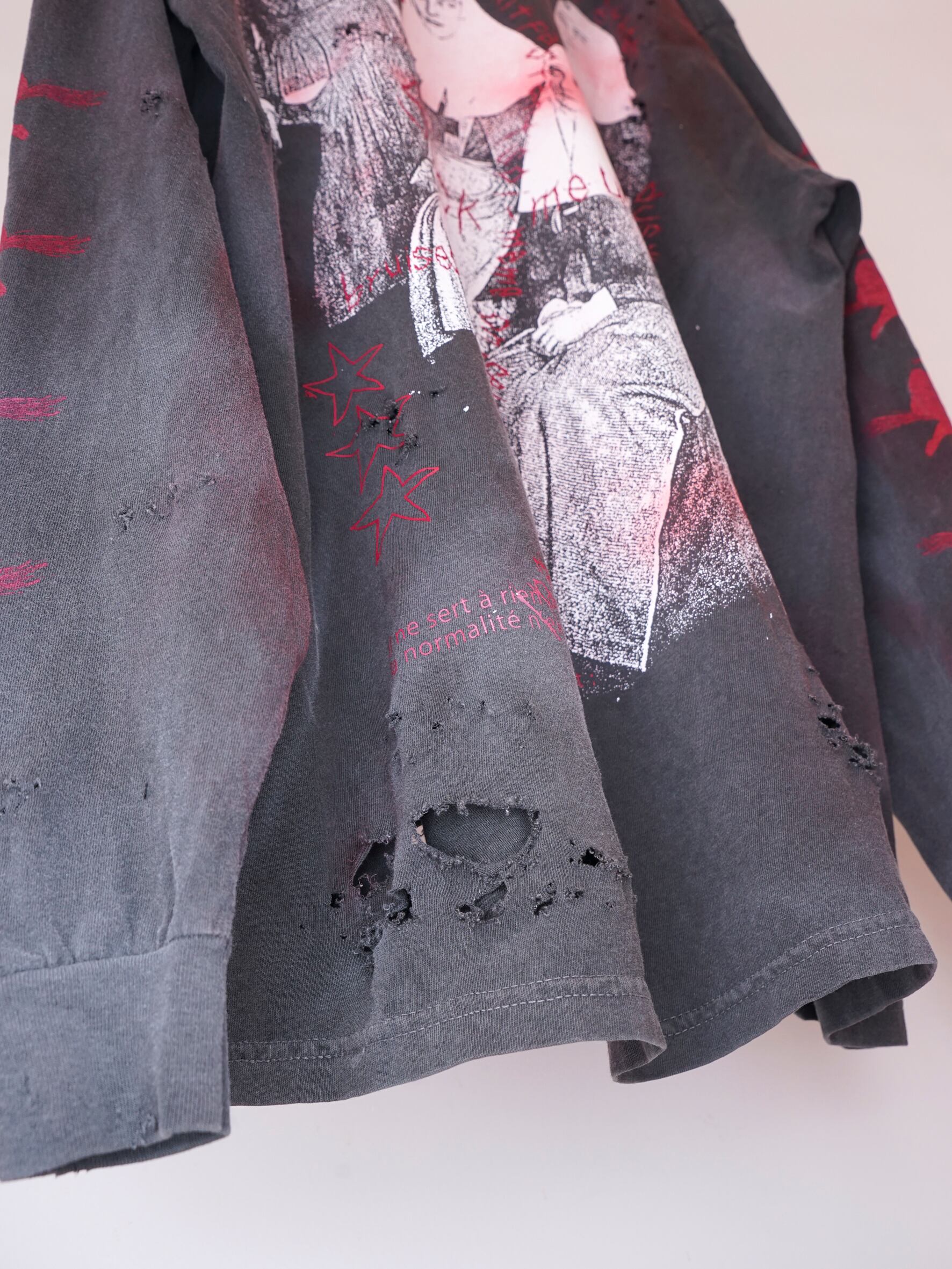 こちらはダメージ、顔料加工のあるverです。XLのサイズ感でユニセックスでご着用いただけます。※ダメージ、顔料加工はあくまでもイメージとなります。個体差がございますのでご了承くださいませ。