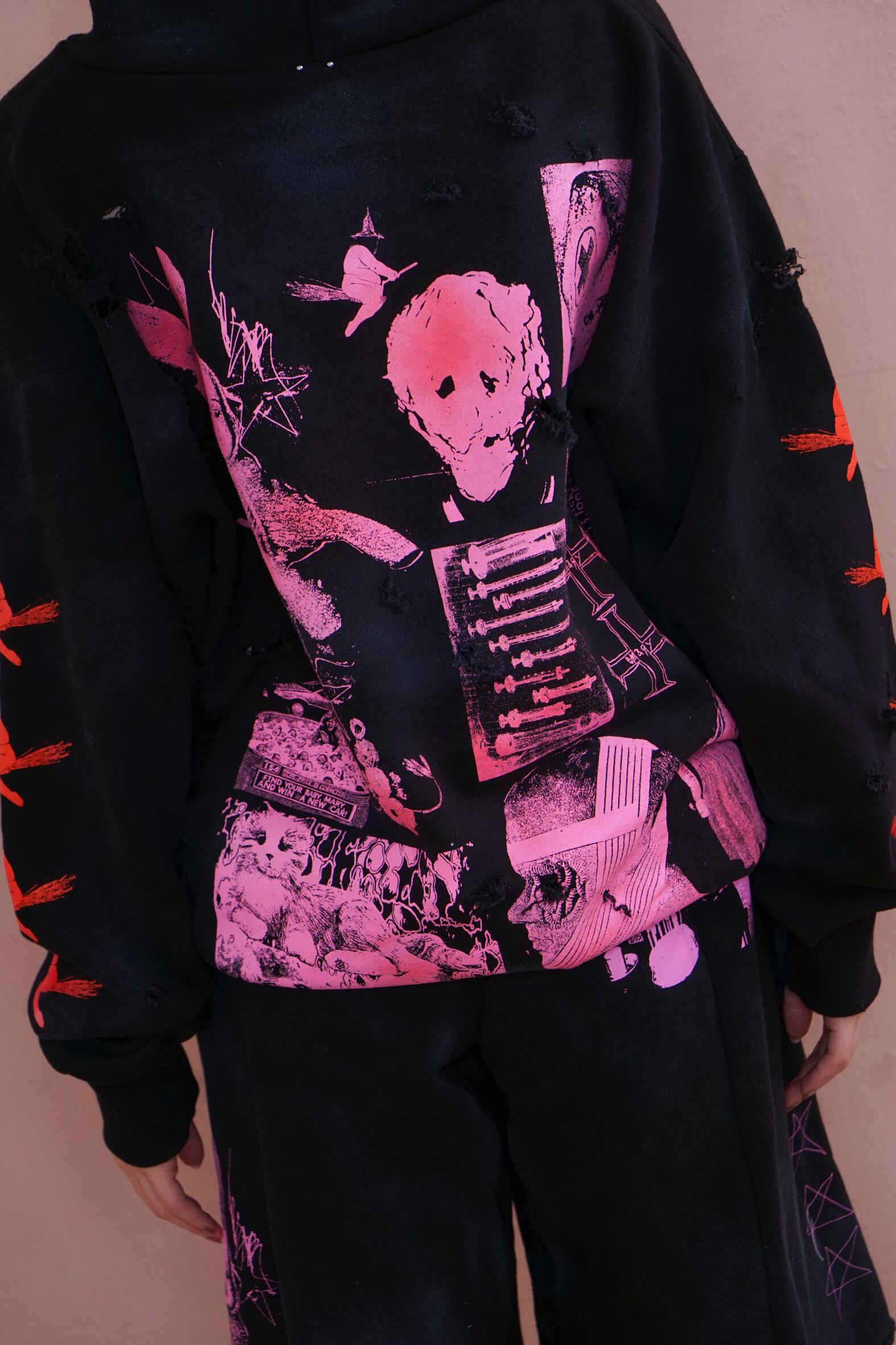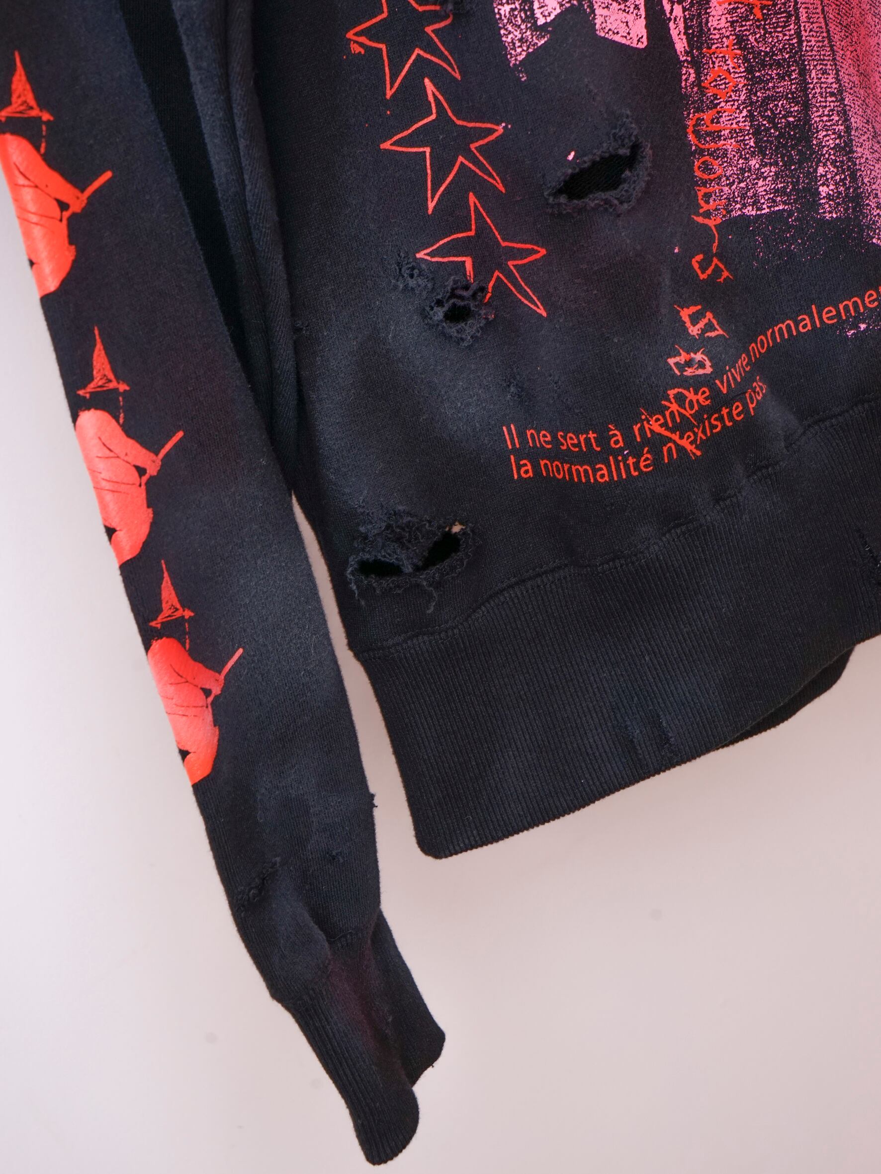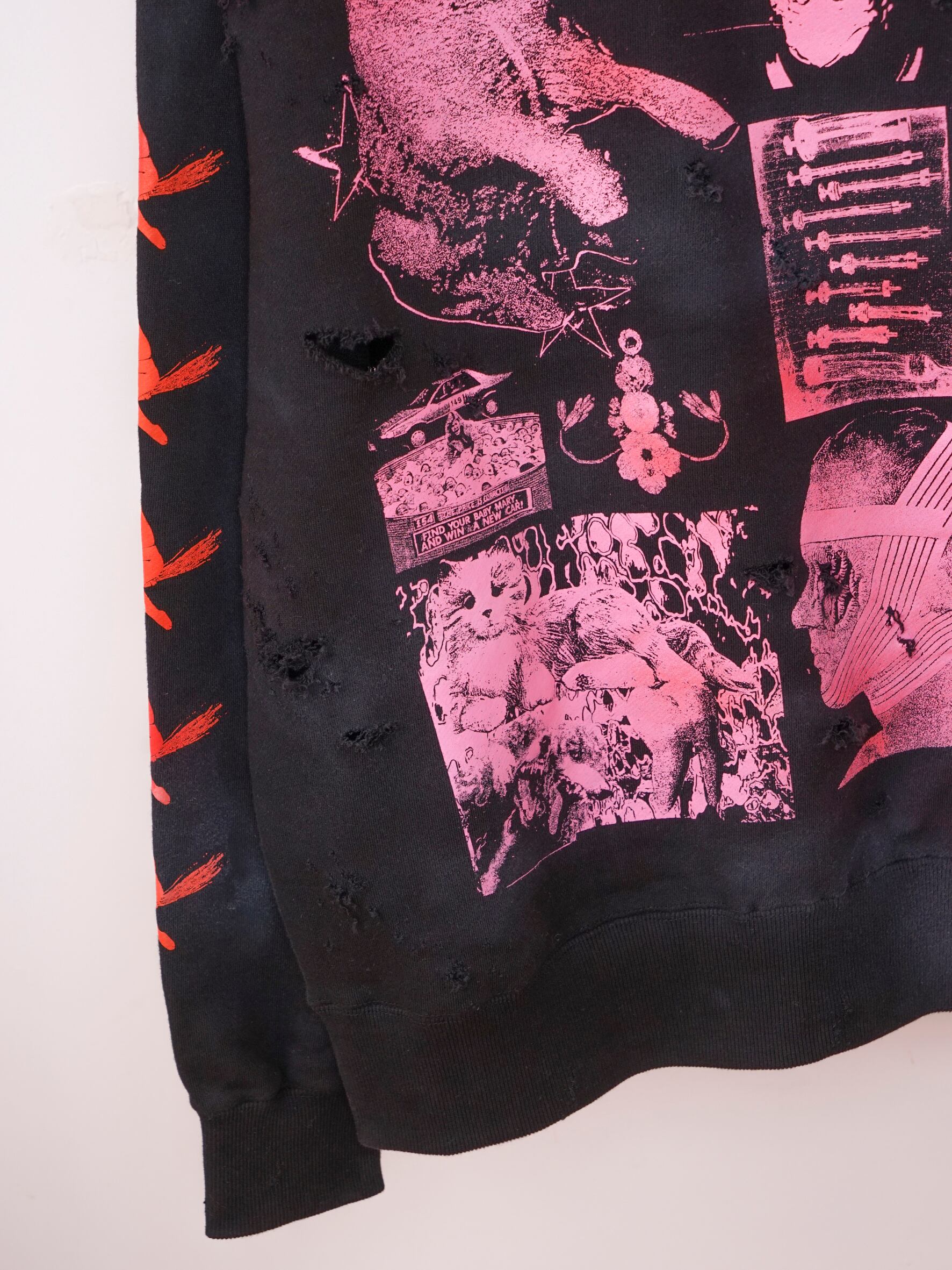 こちらはダメージ、顔料加工のあるverです。XLのサイズ感でユニセックスでご着用いただけます。※ダメージ、顔料加工はあくまでもイメージとなります。個体差がございますのでご了承くださいませ。