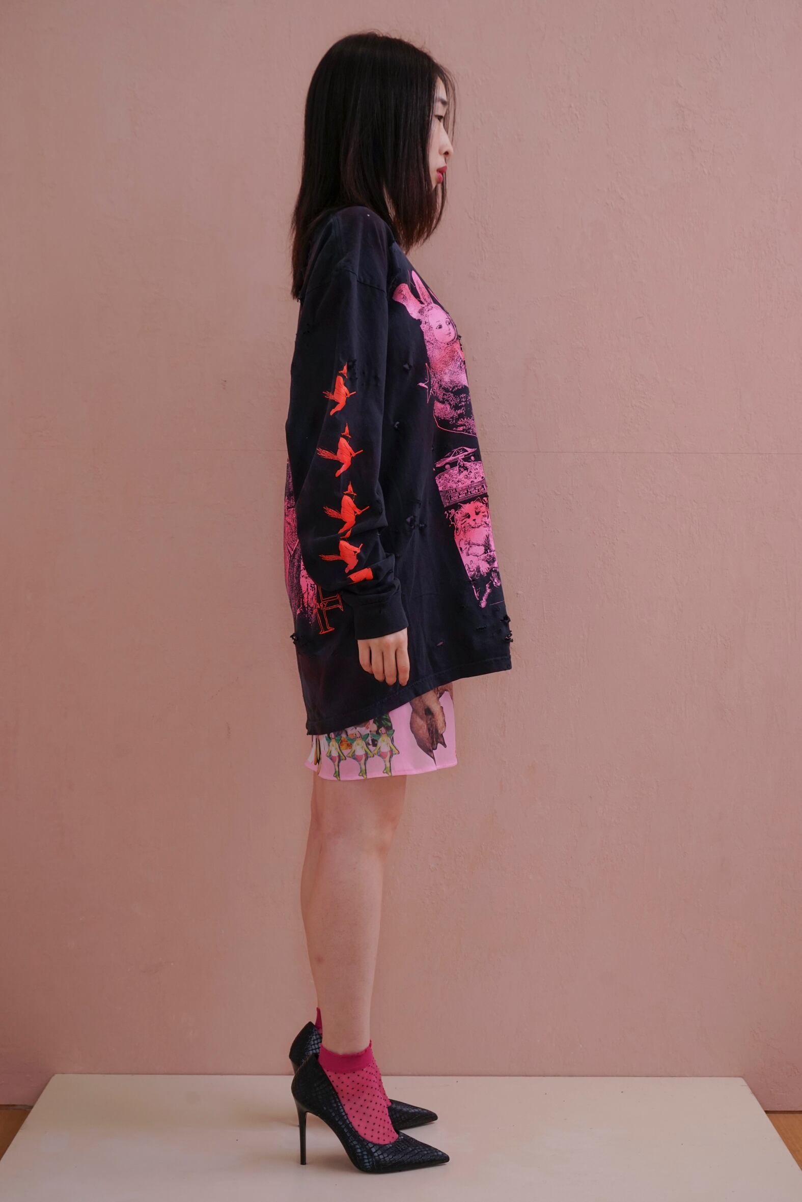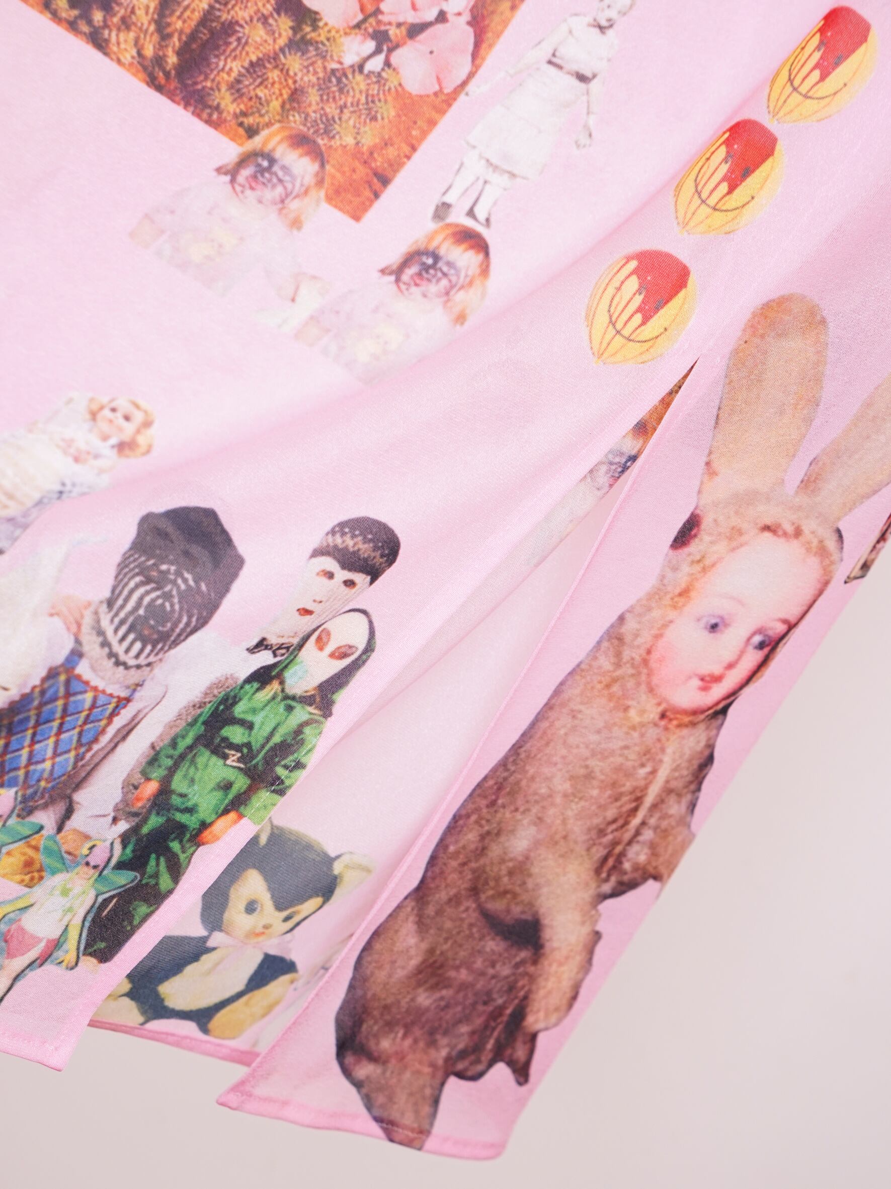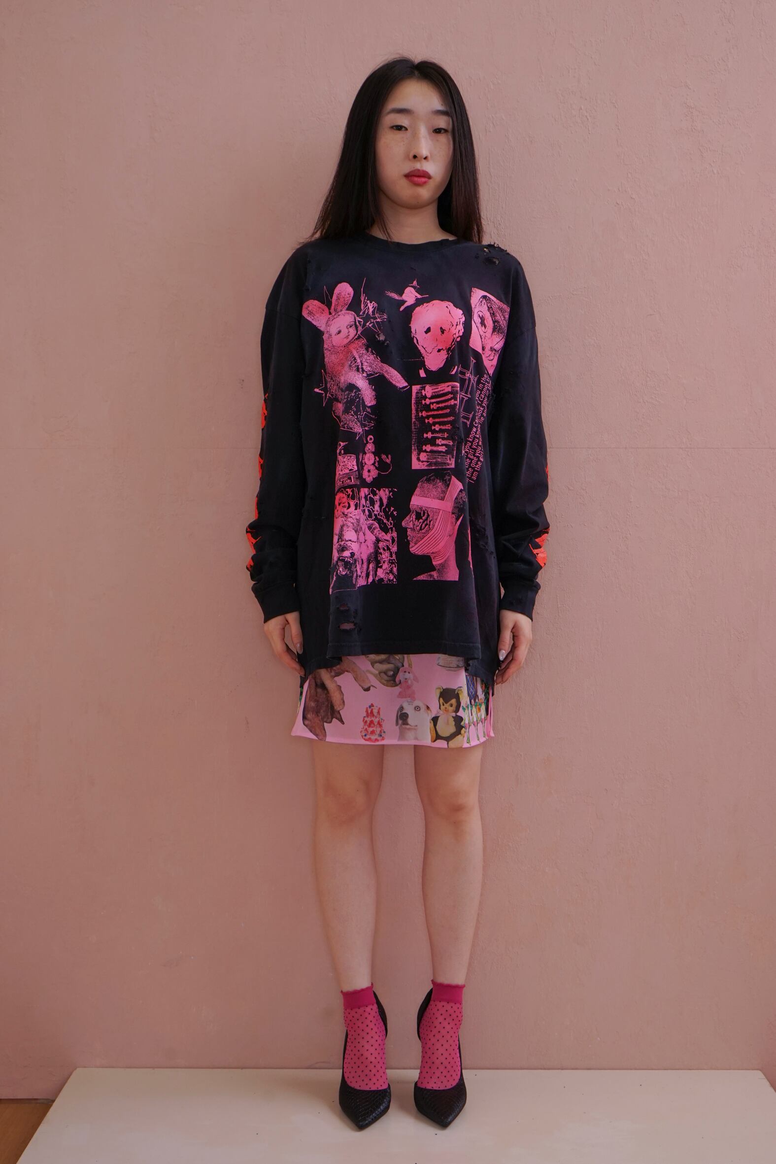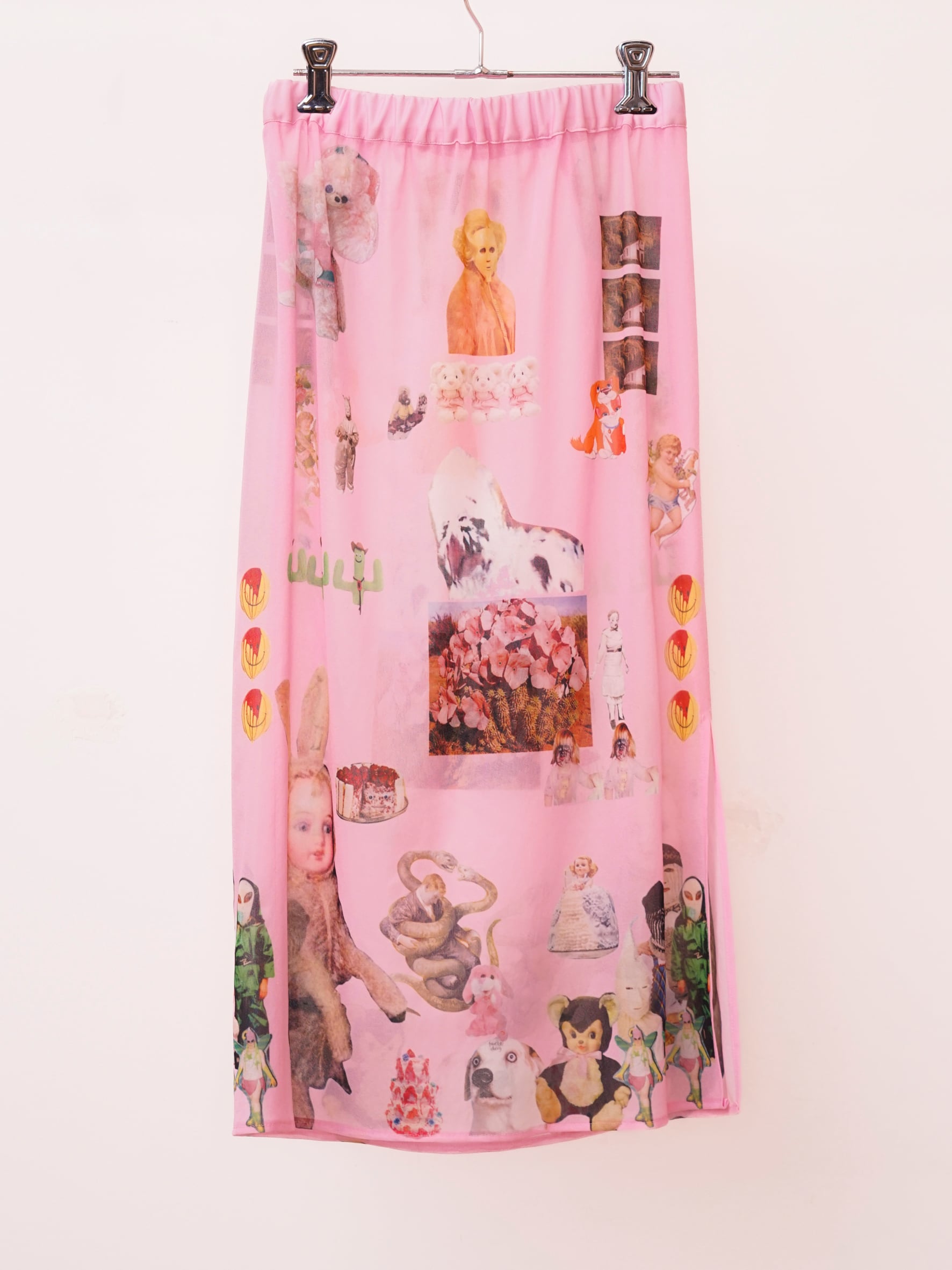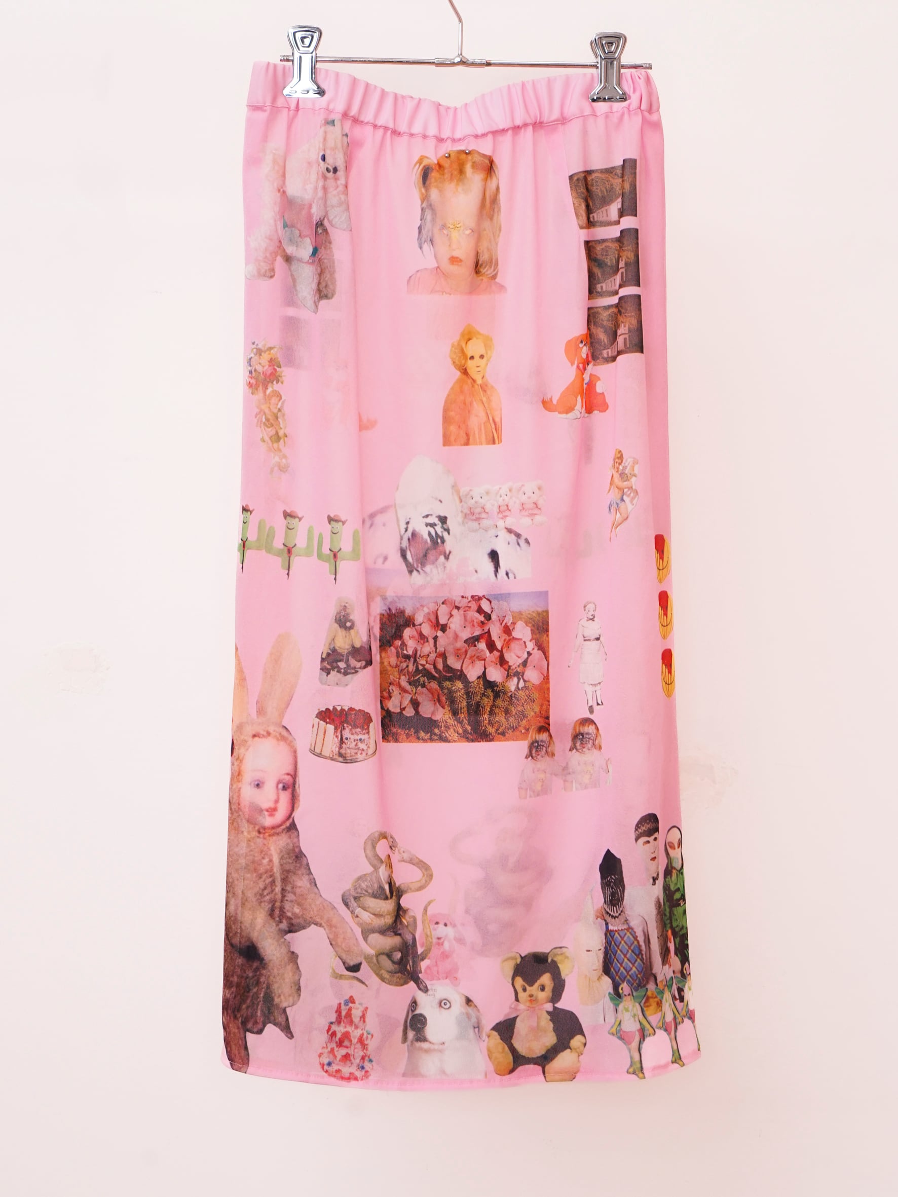 POPなgraphicがコラージュされたskin skirt。あえて手作業で切り抜きをし、掠れていたり、不完全なプリントの仕様もポイントです。