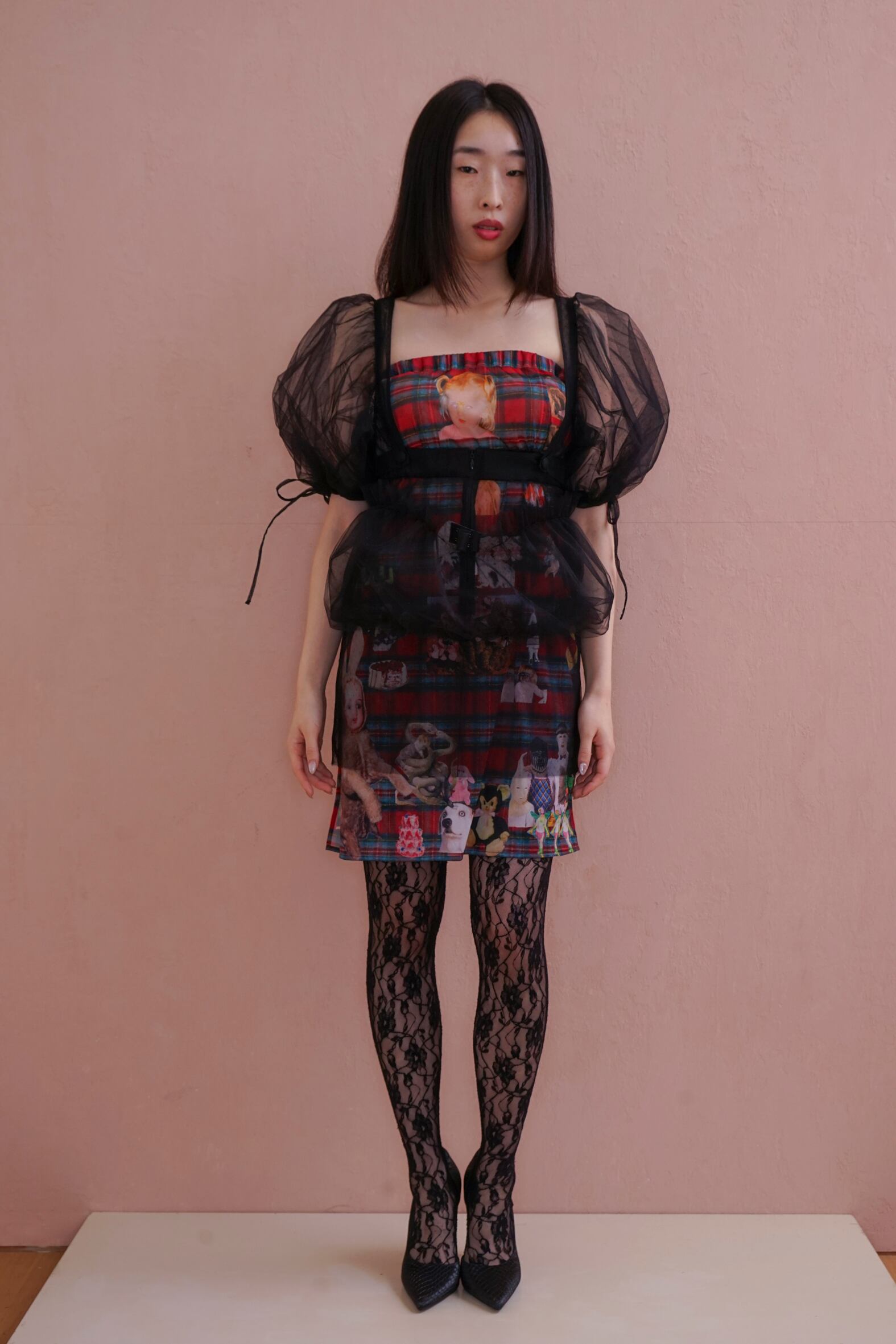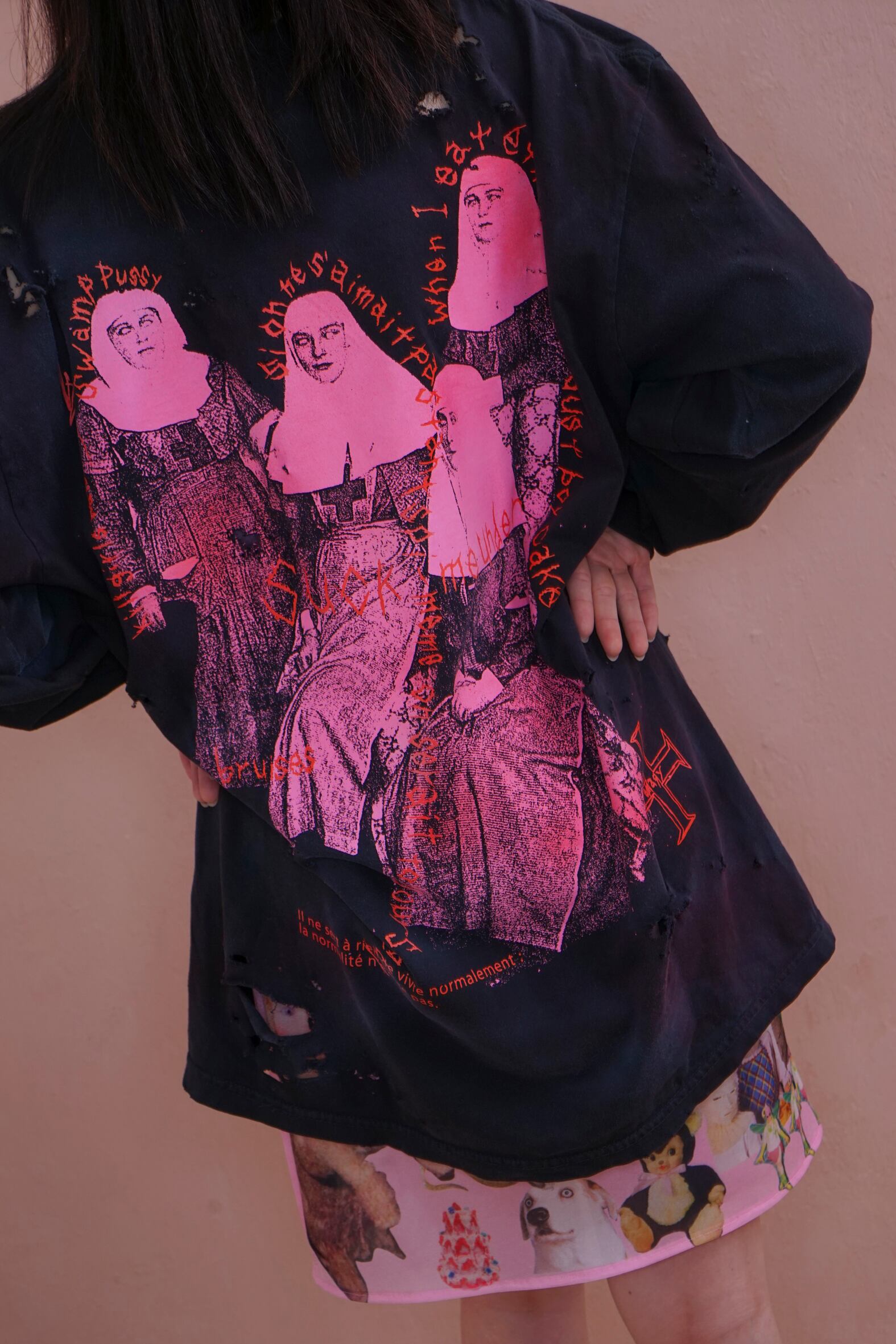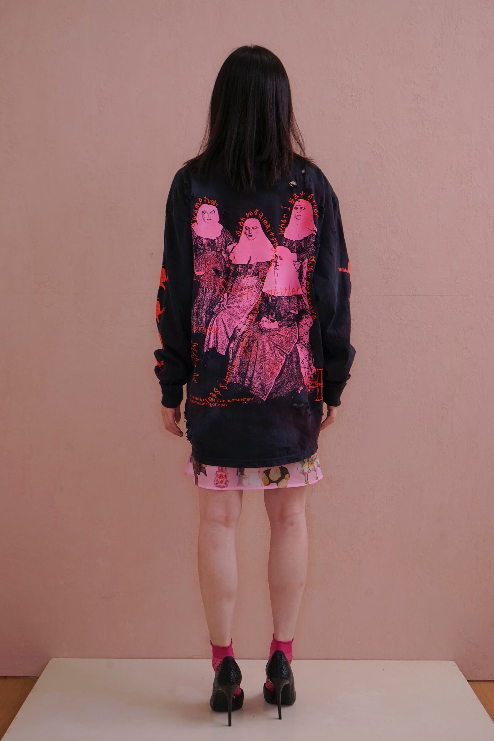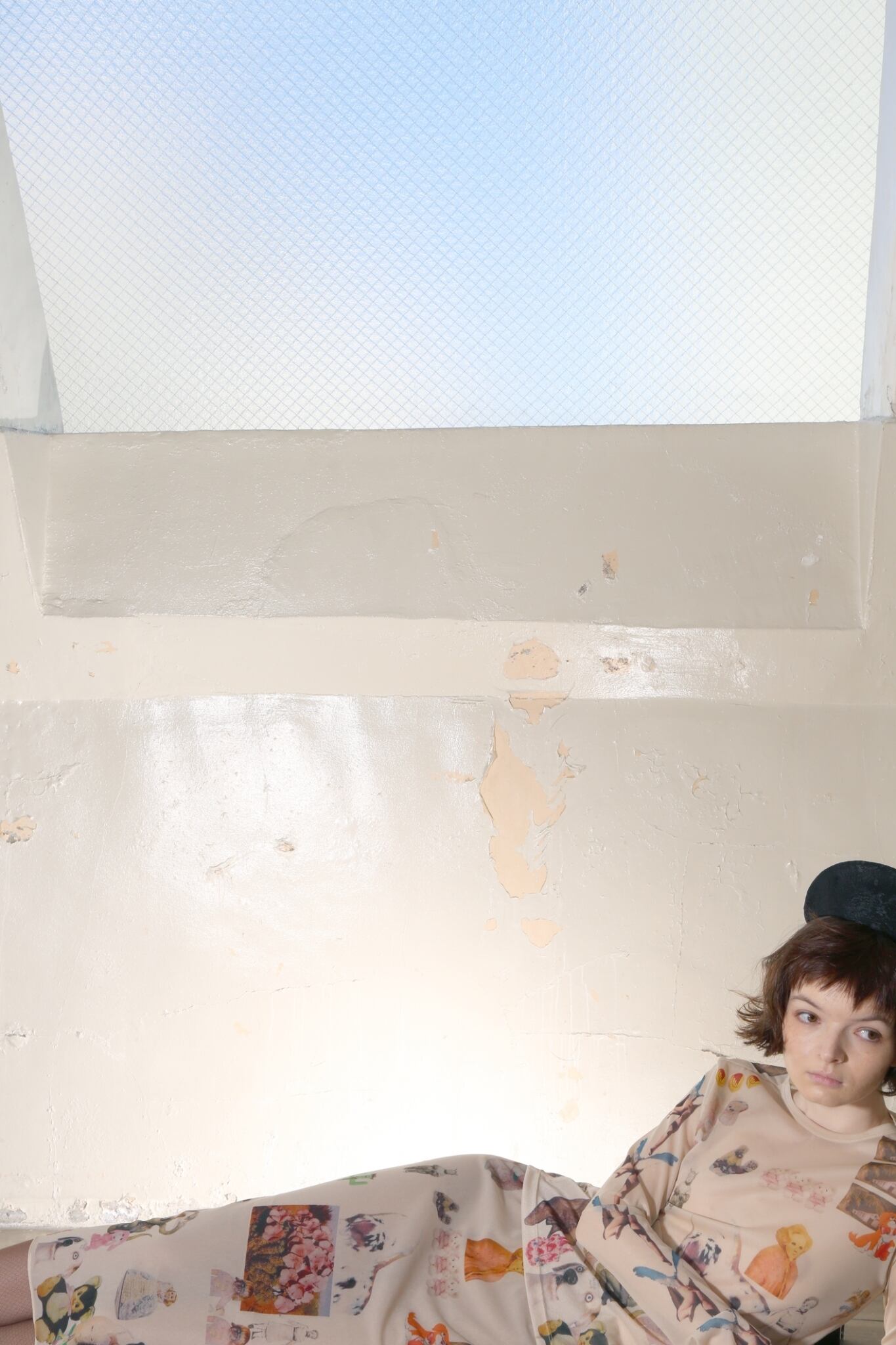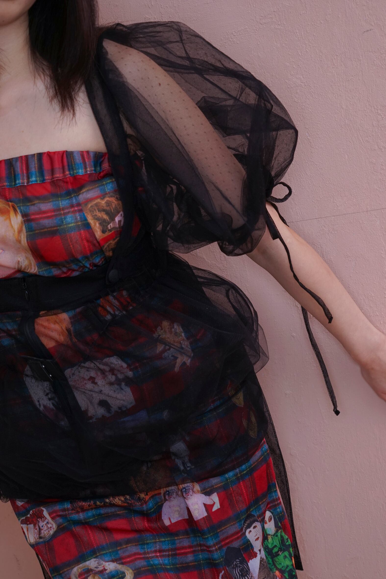 POPなgraphicがコラージュされたskin skirt。あえて手作業で切り抜きをし、掠れていたり、不完全なプリントの仕様もポイントです。