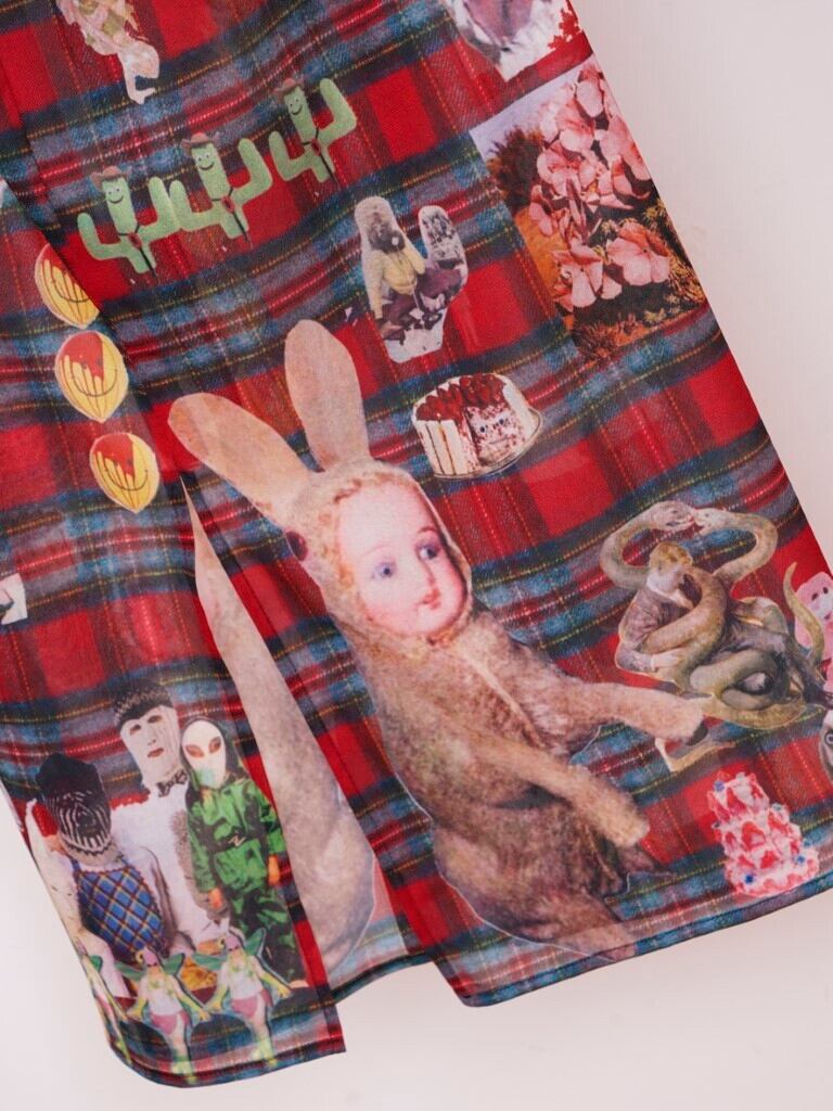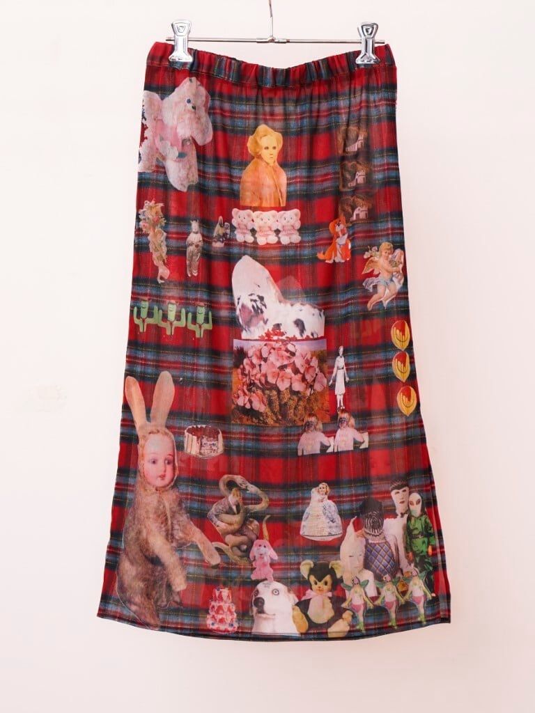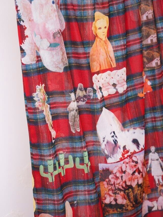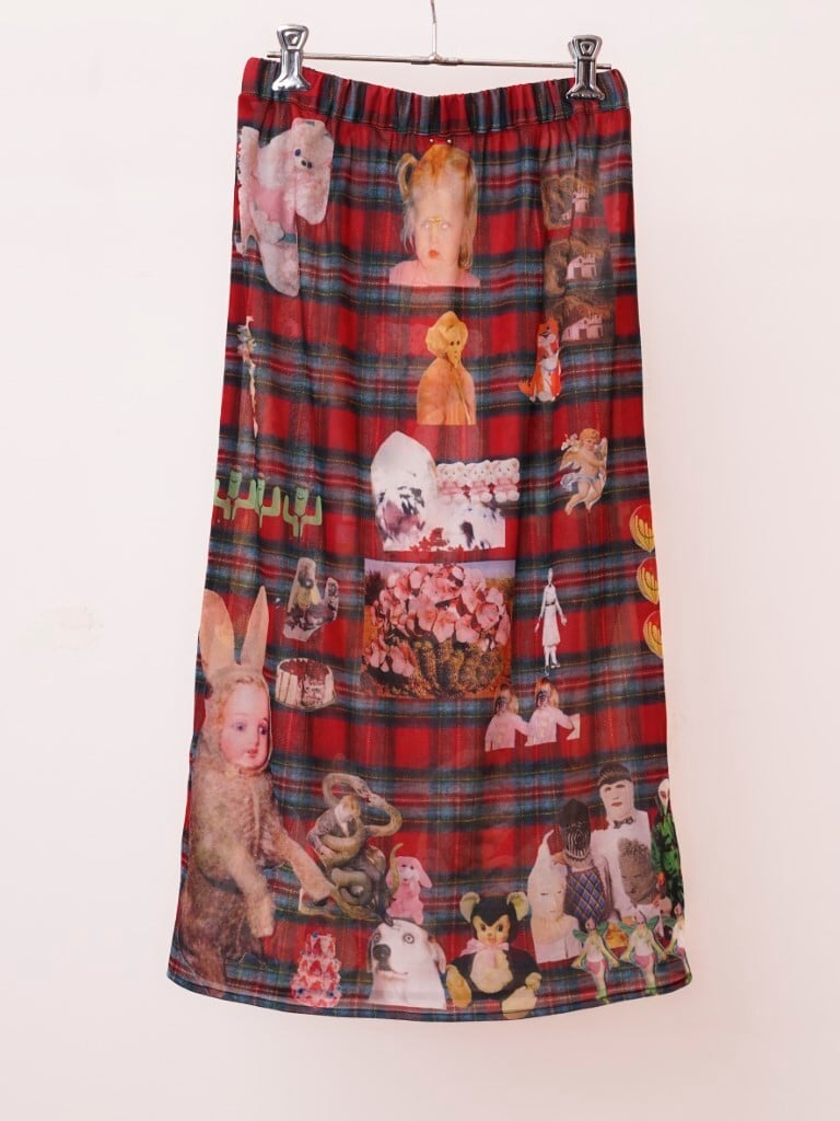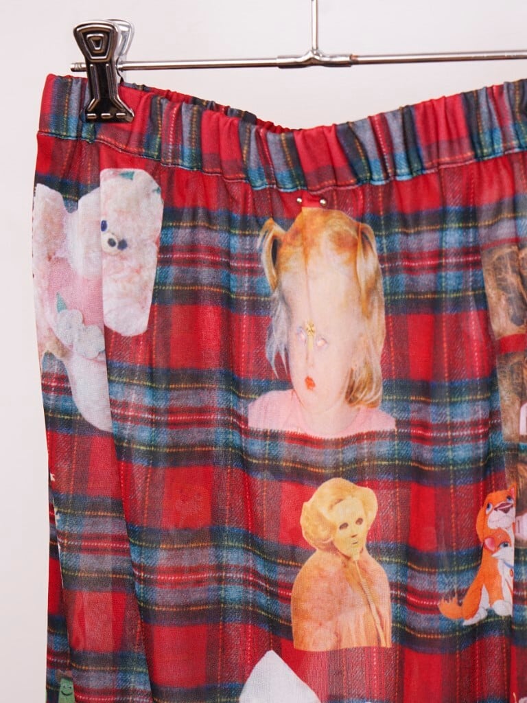 POPなgraphicがコラージュされたskin skirt。あえて手作業で切り抜きをし、掠れていたり、不完全なプリントの仕様もポイントです。