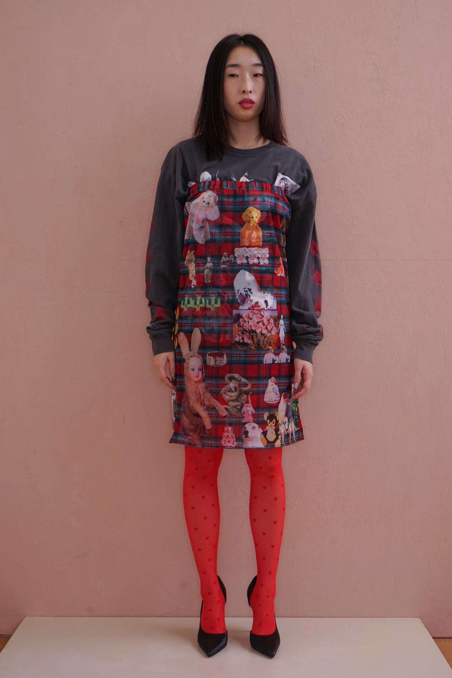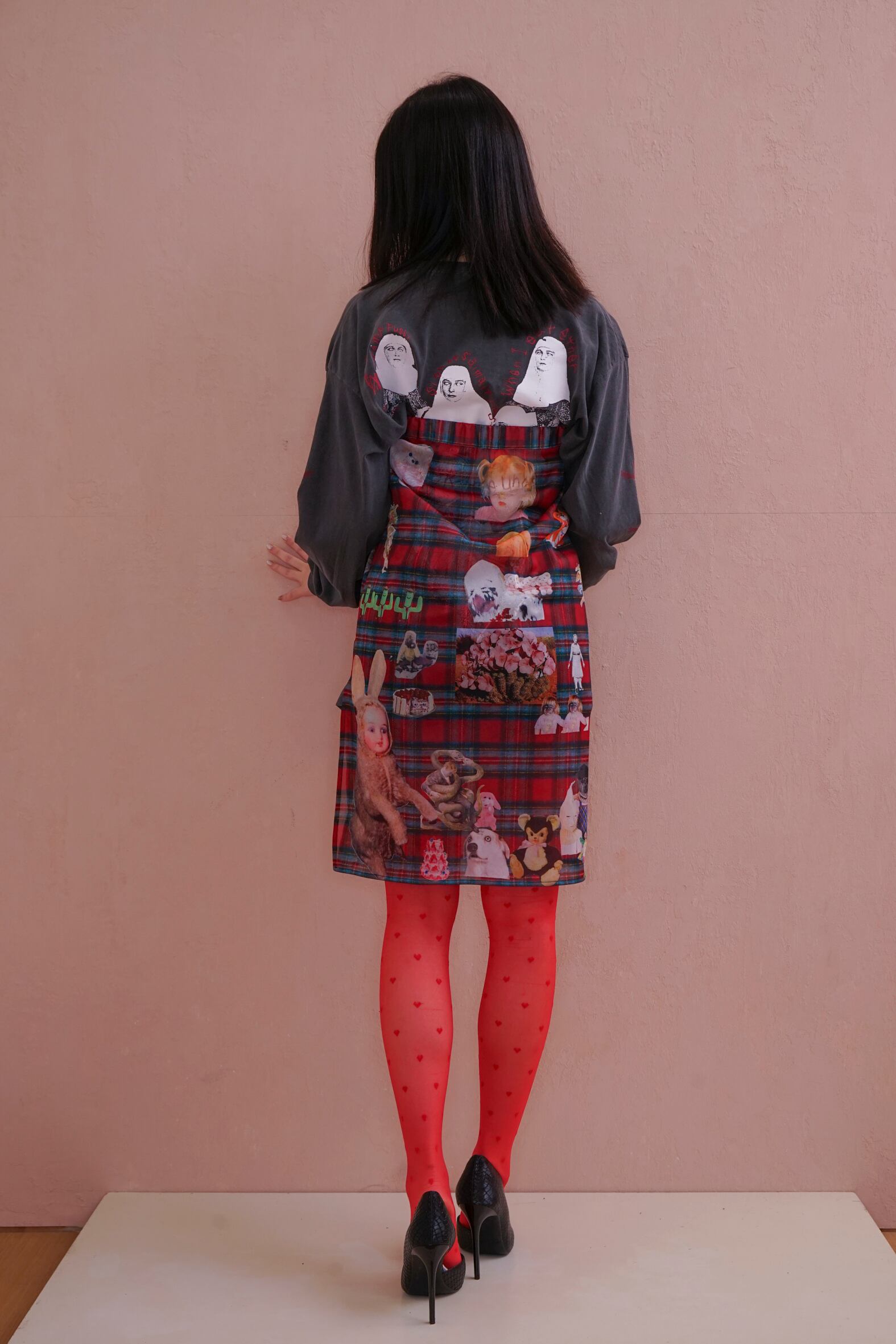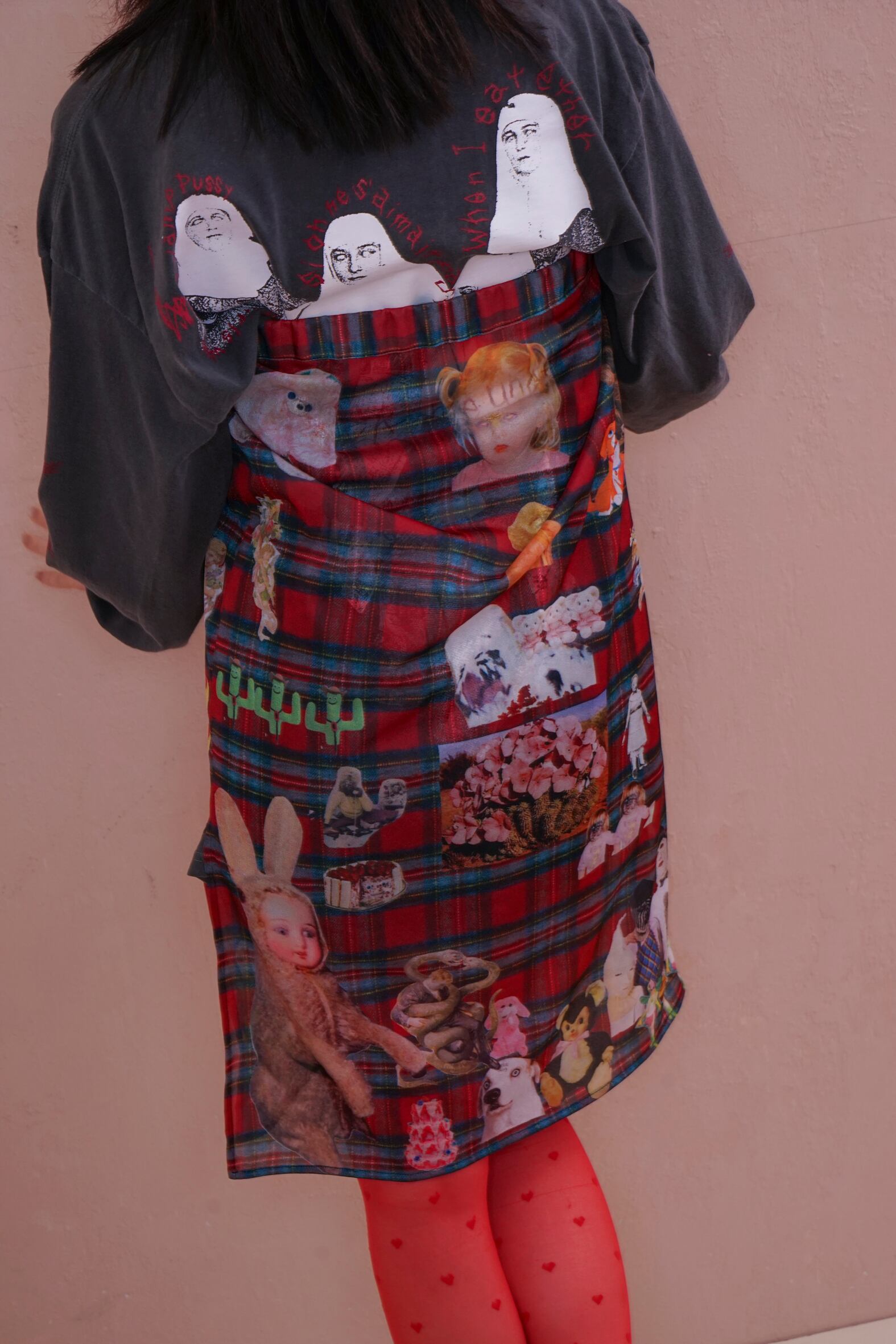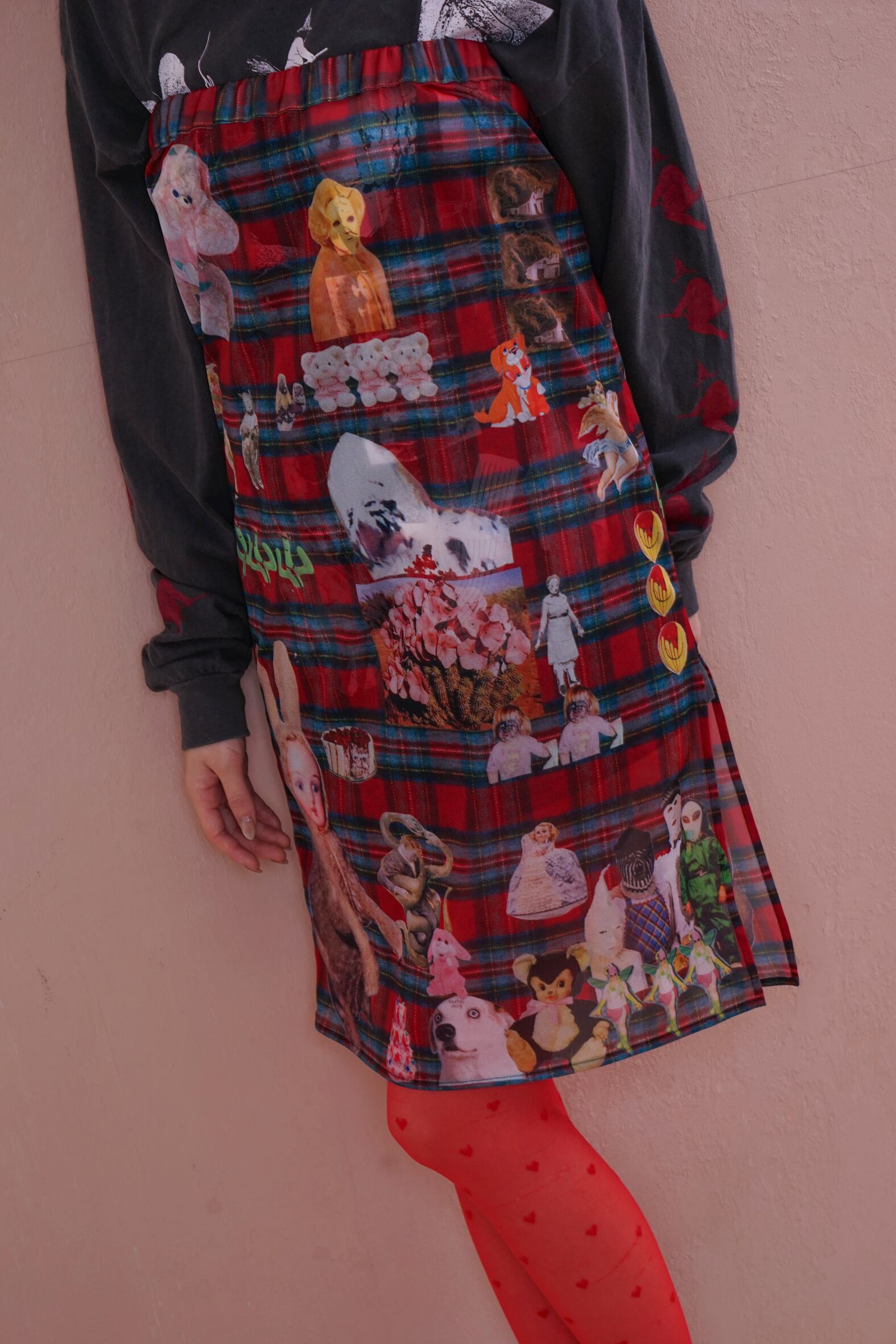 POPなgraphicがコラージュされたskin skirt。あえて手作業で切り抜きをし、掠れていたり、不完全なプリントの仕様もポイントです。